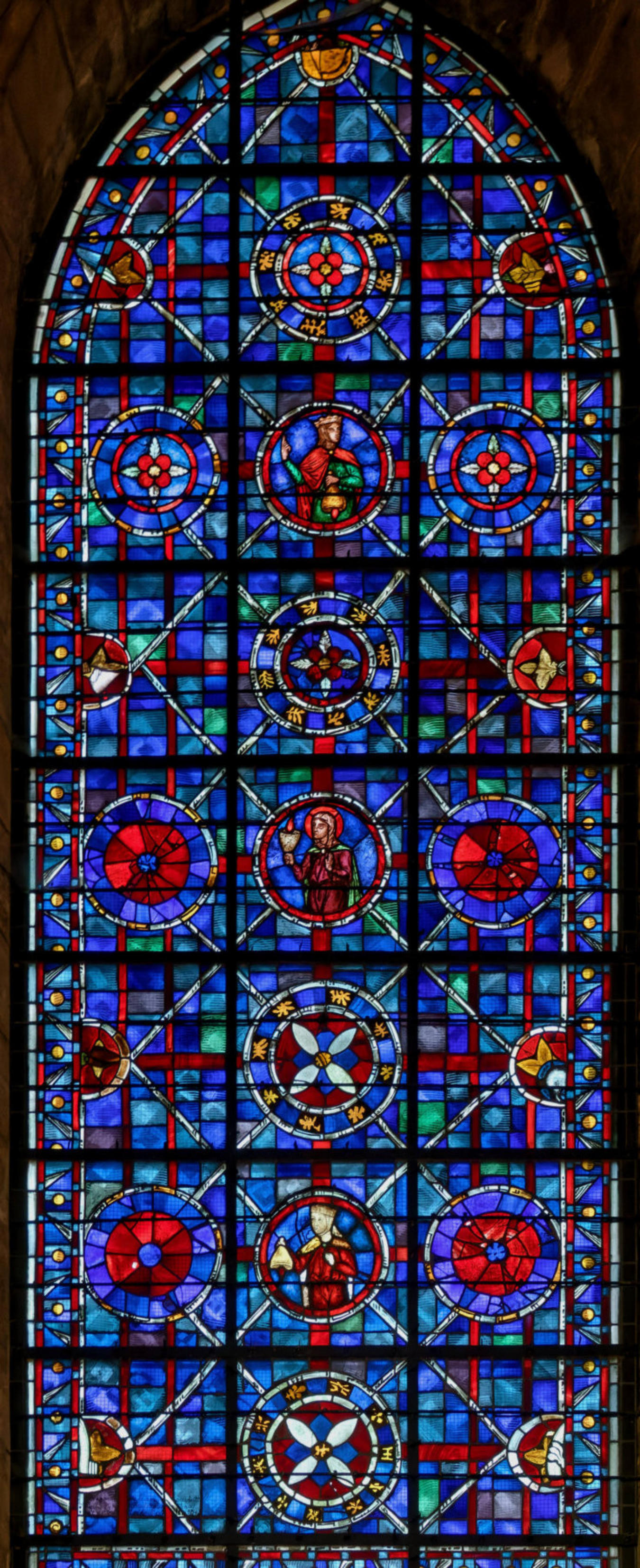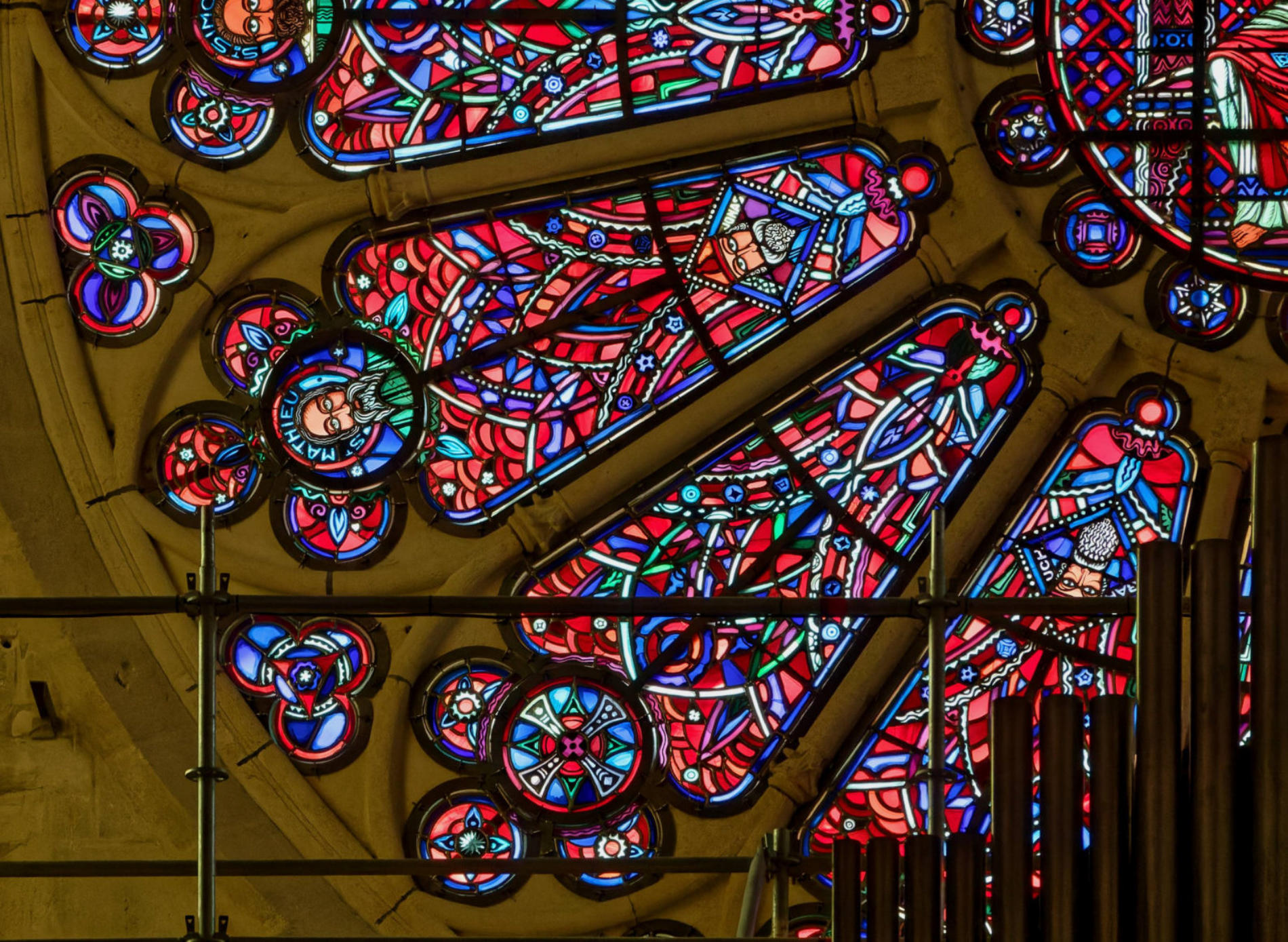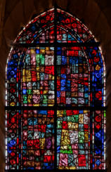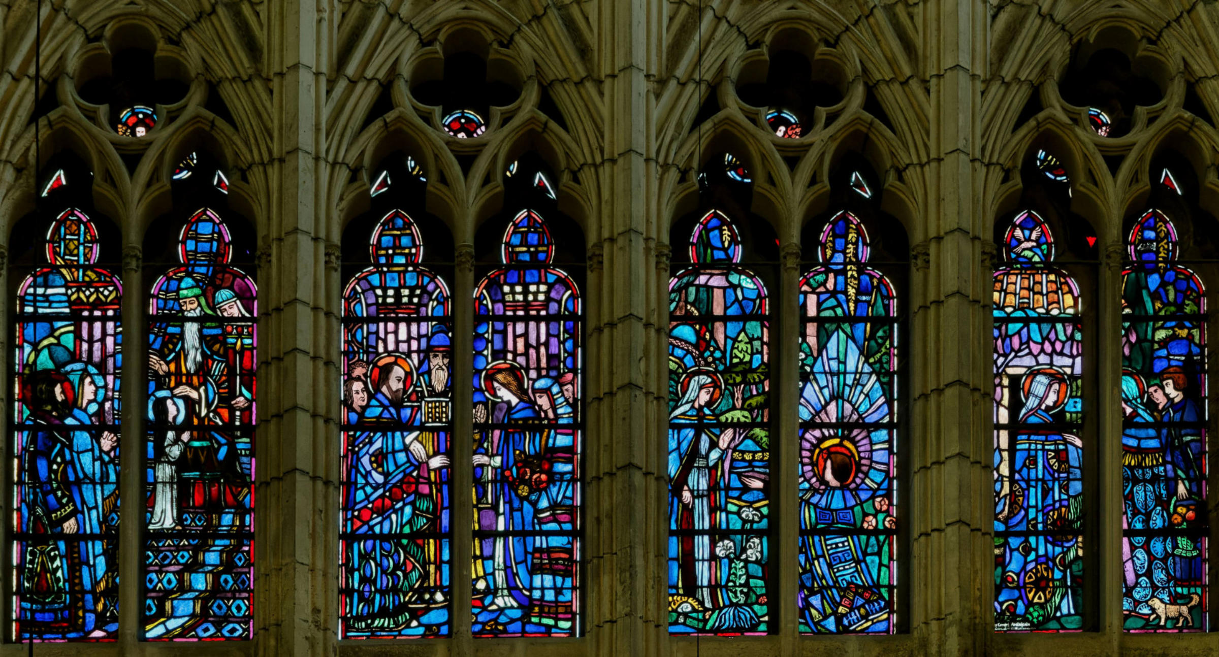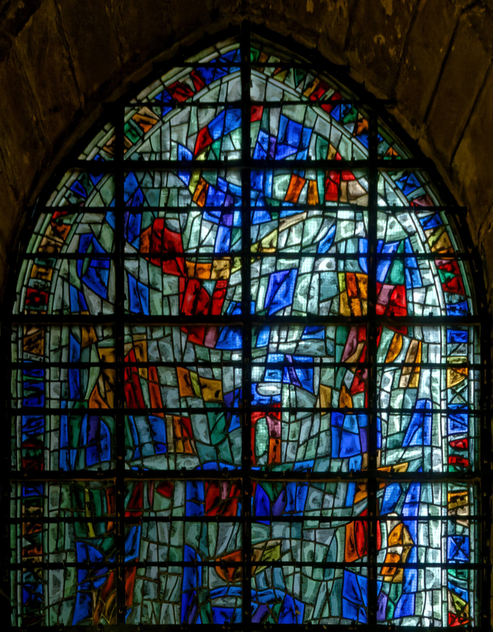 Les vitraux modernes du choeur sont une création de Jacques Le Chevallier