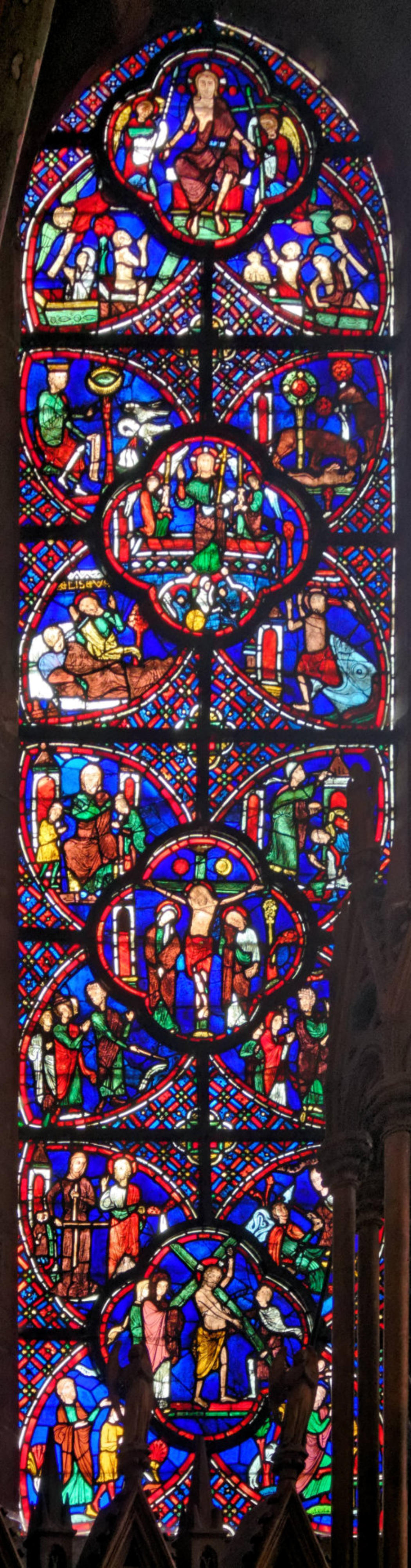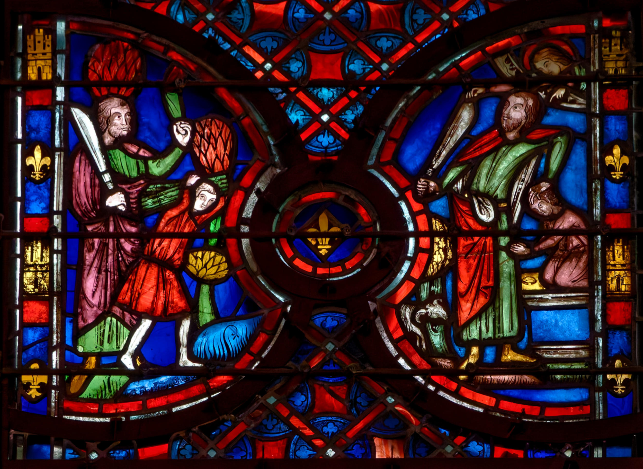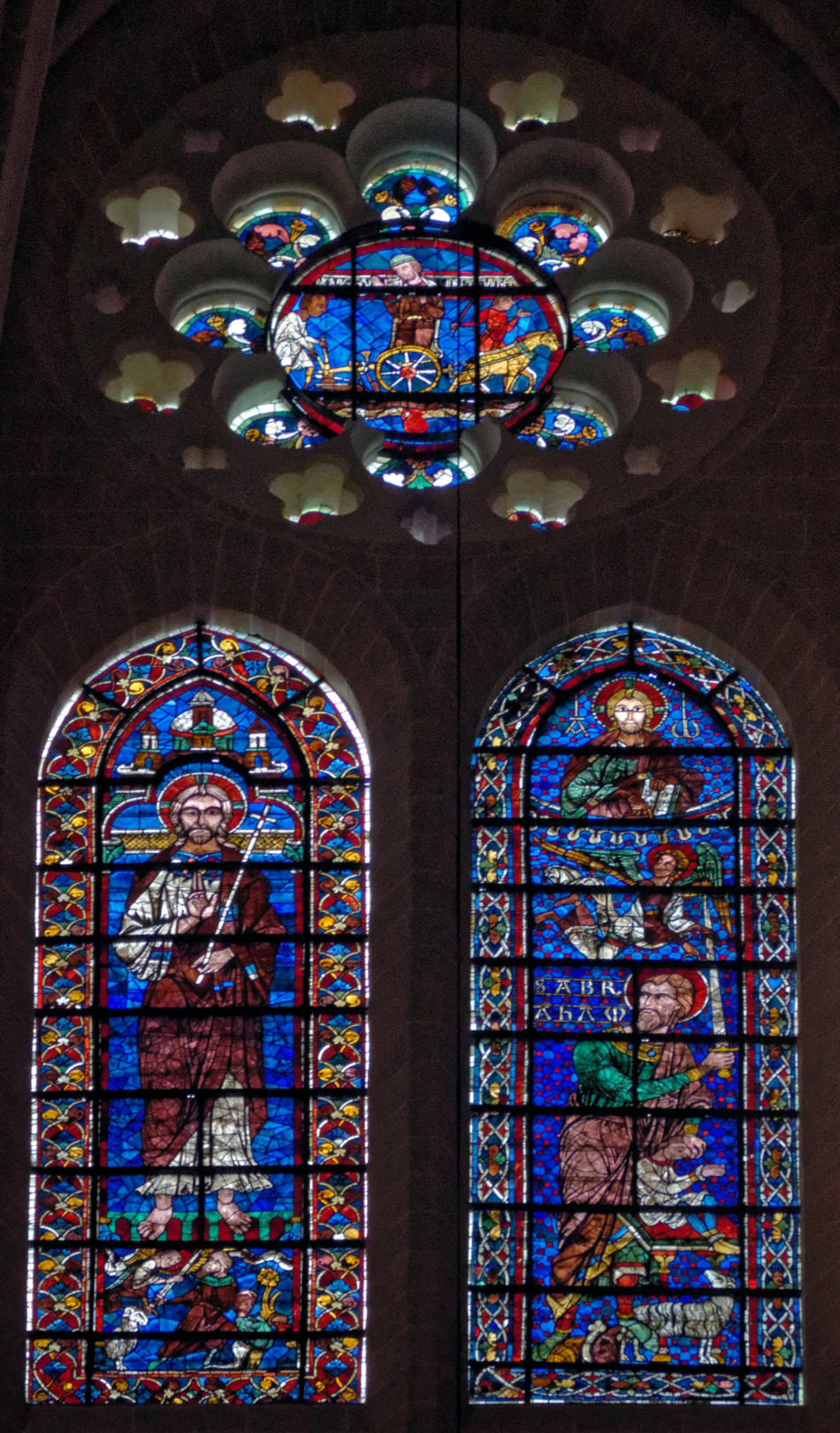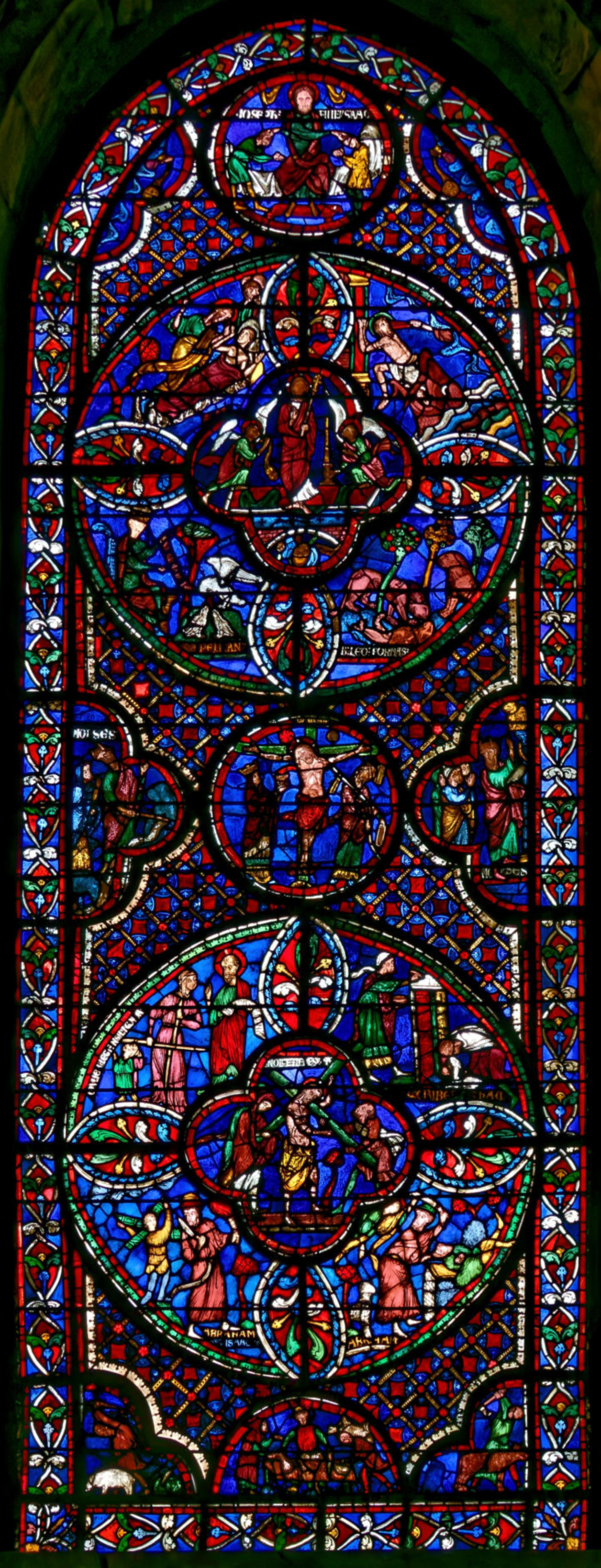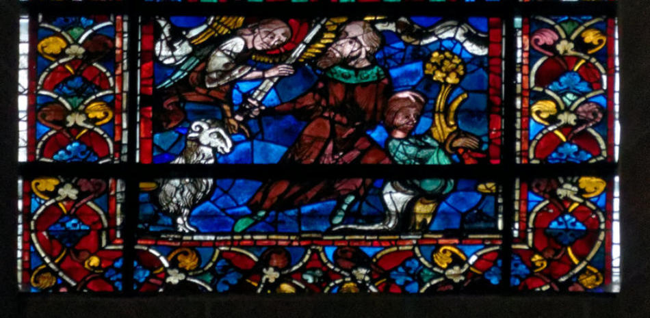 1205-1215 Chartres Cathédrale Notre-DameBaie 1312 lancettes En soubassement du Christ bénissant la croix, l’ange empêche Abraham de sacrifier Isaac (avec un bouc sur la scène) et sur l’autre lancette, la scène est répétée en grand
