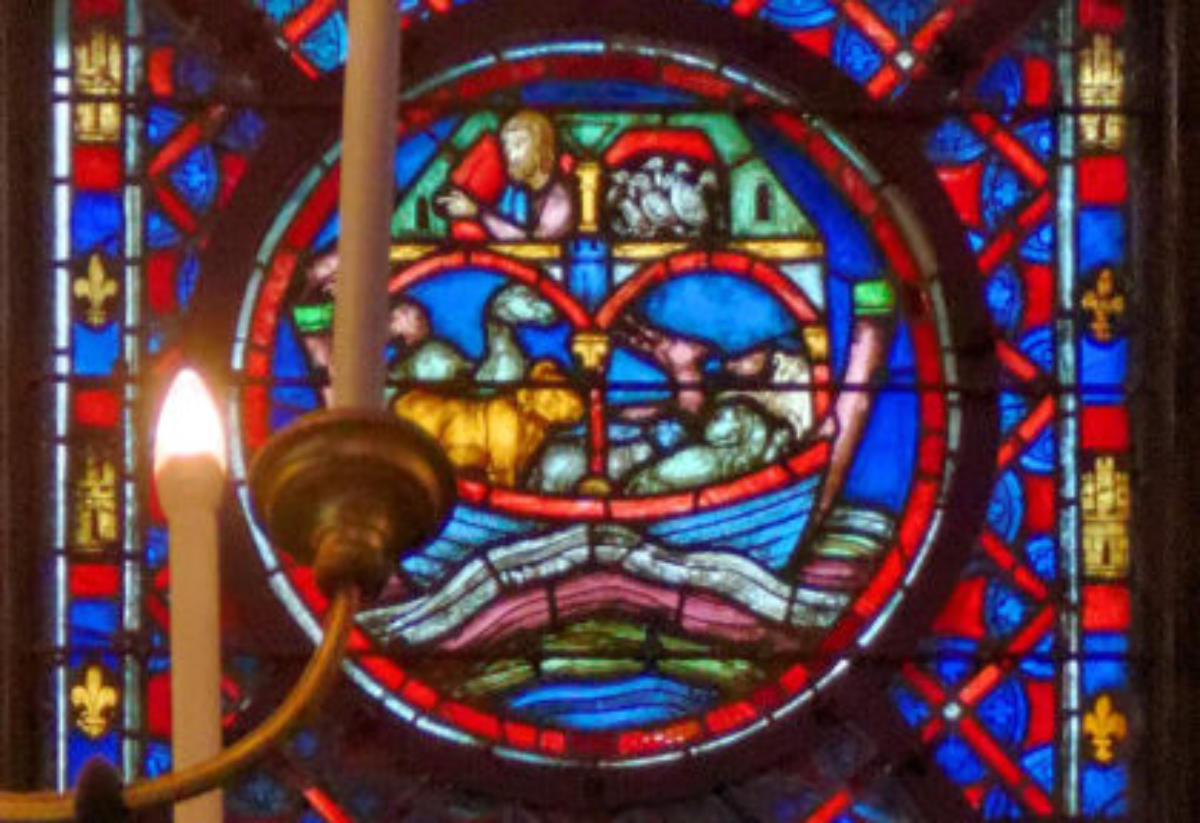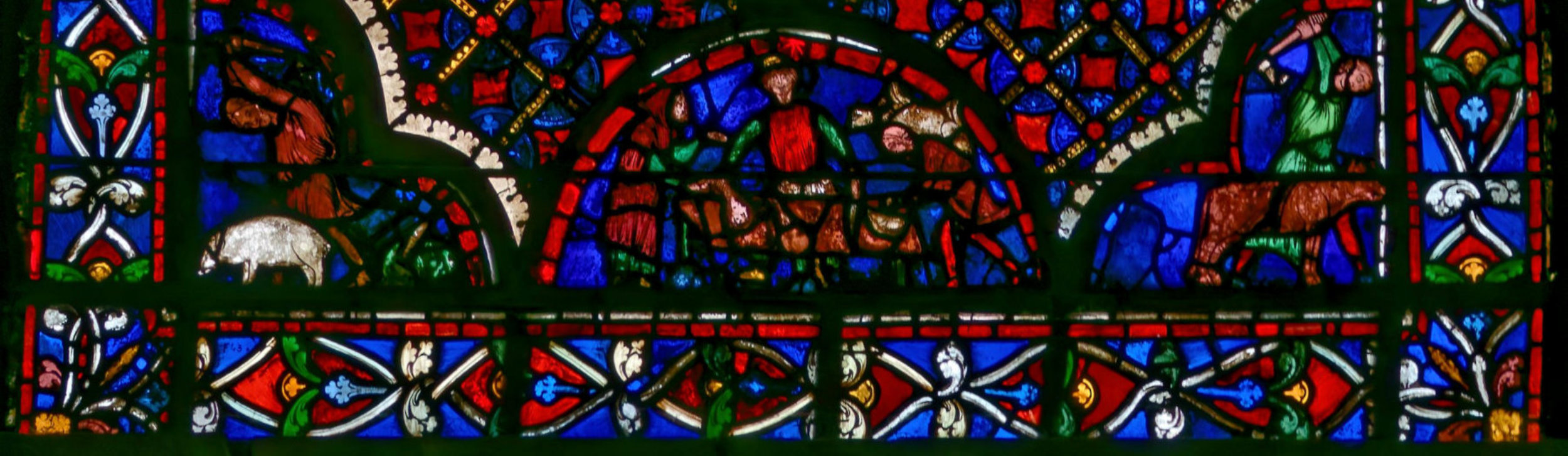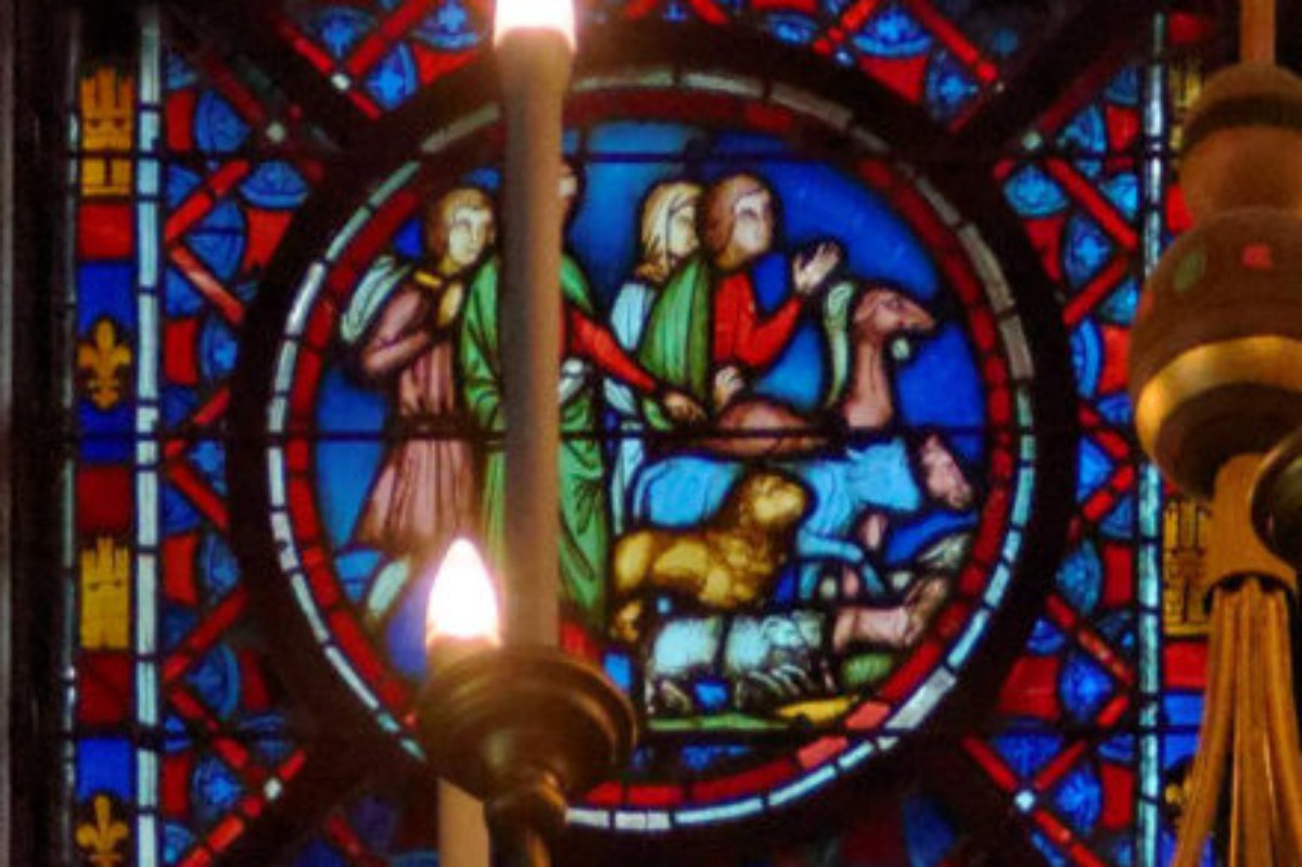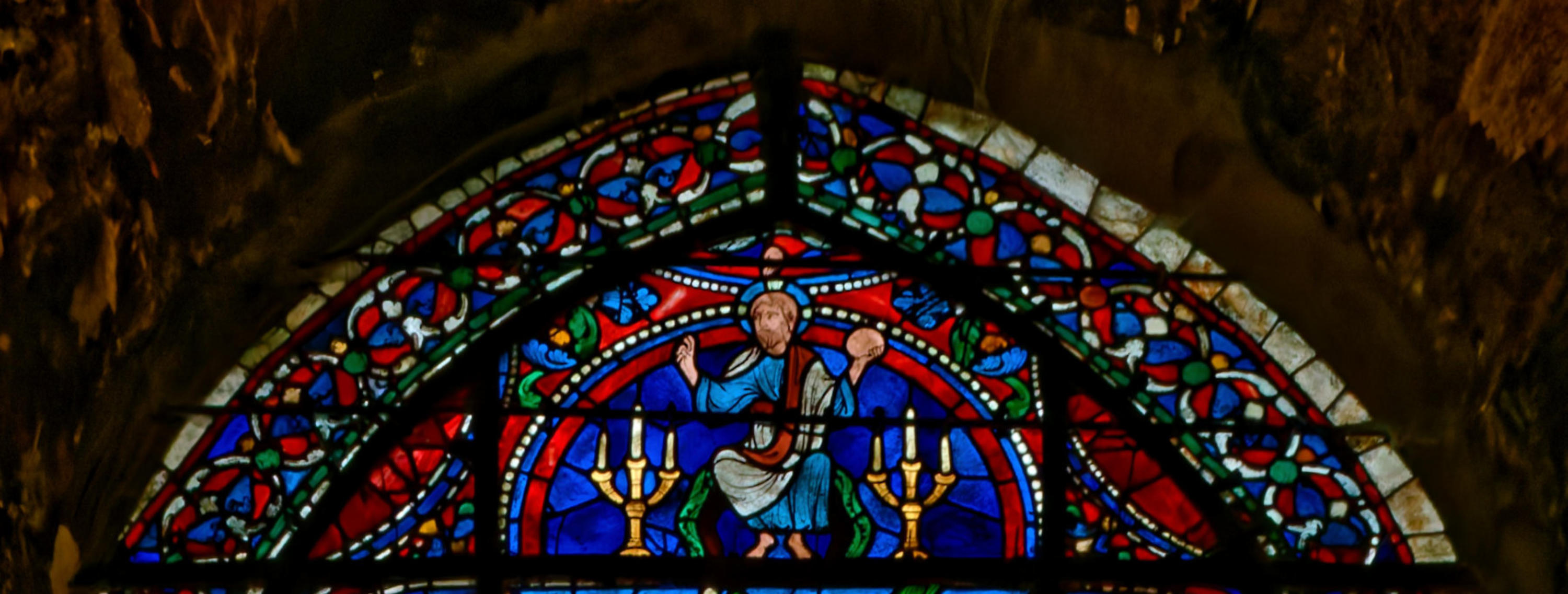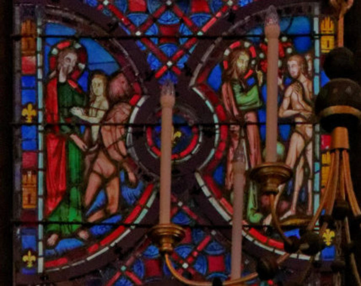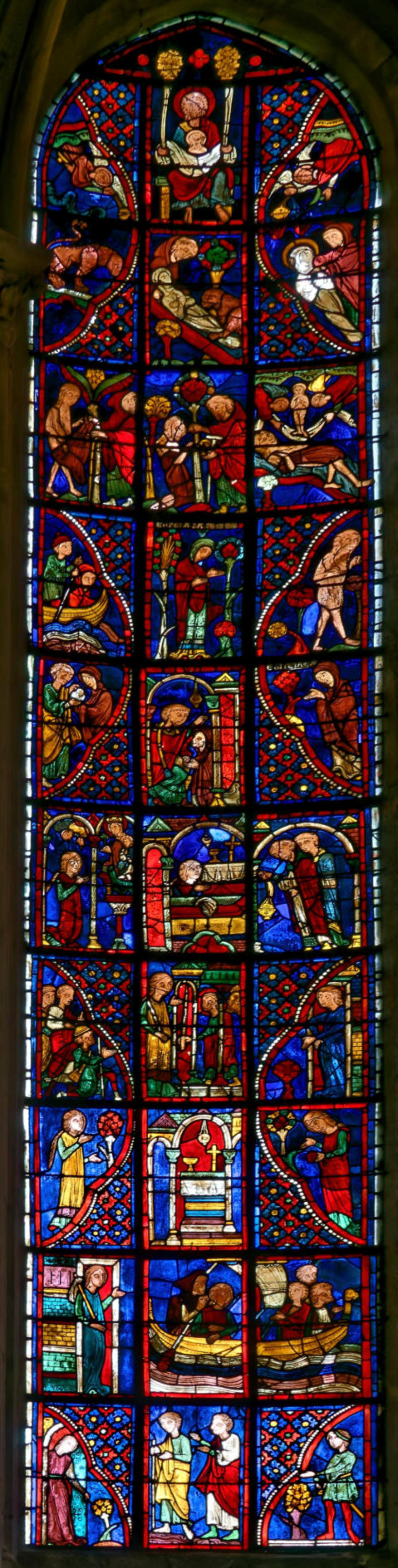 1205-1215 Chartres Cathédrale Notre-DameBaie 1312 lancettes En soubassement du Christ bénissant la croix, l’ange empêche Abraham de sacrifier Isaac (avec un bouc sur la scène) et sur l’autre lancette, la scène est répétée en grand