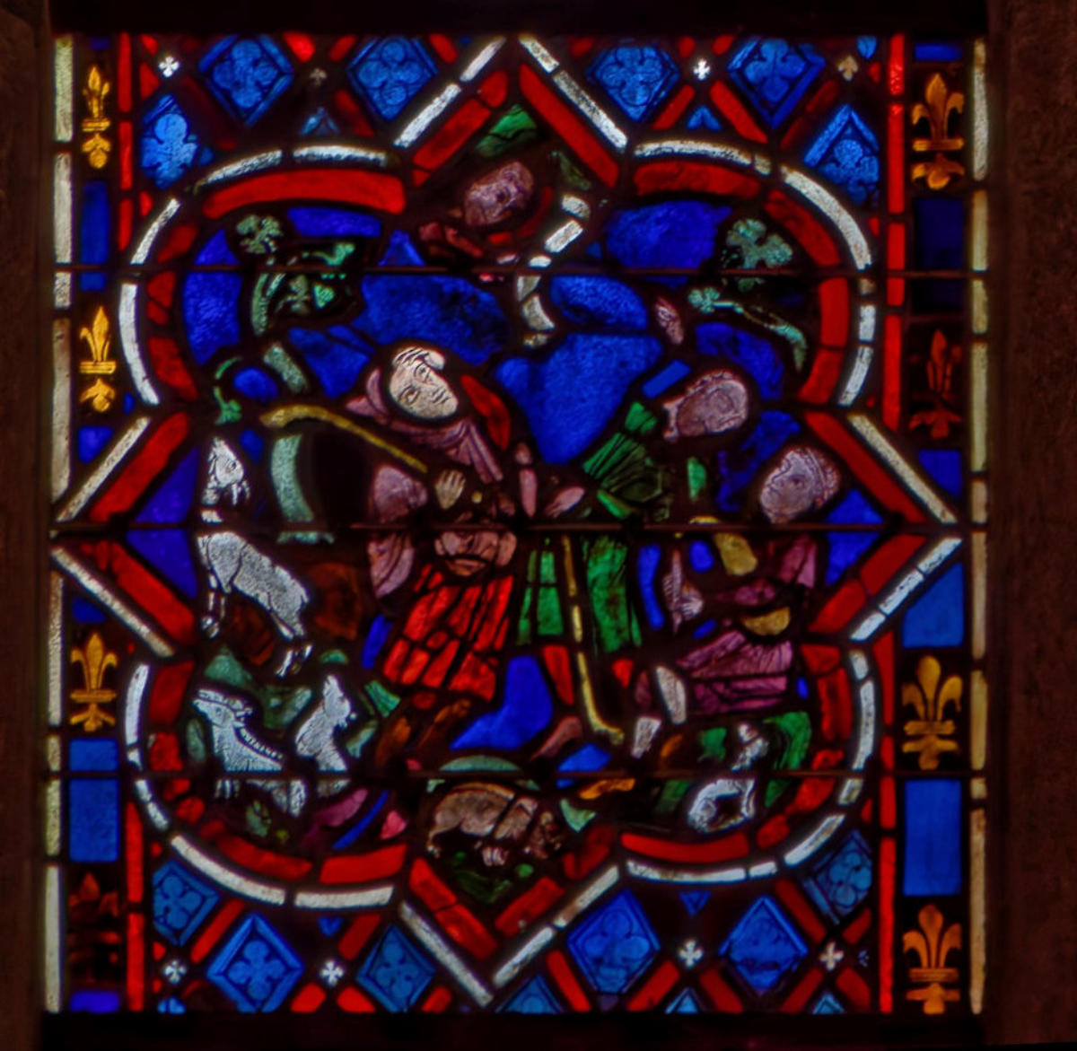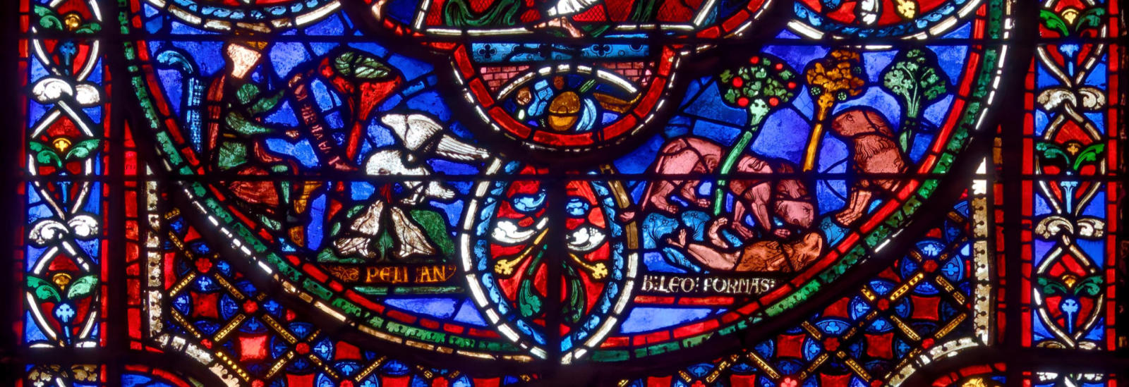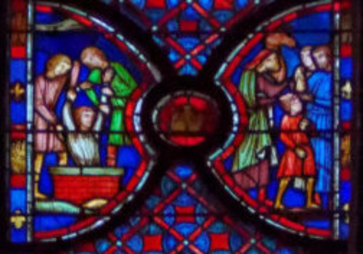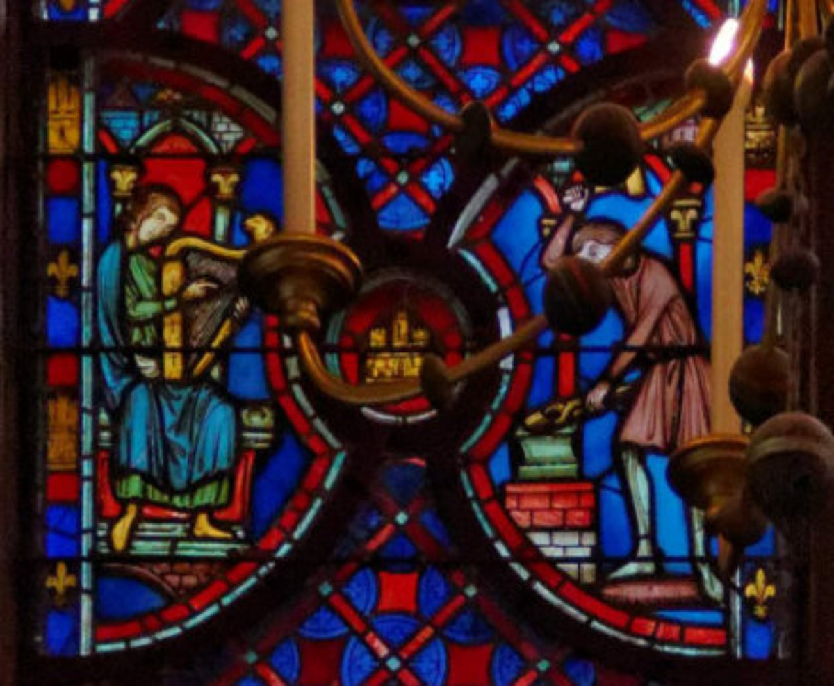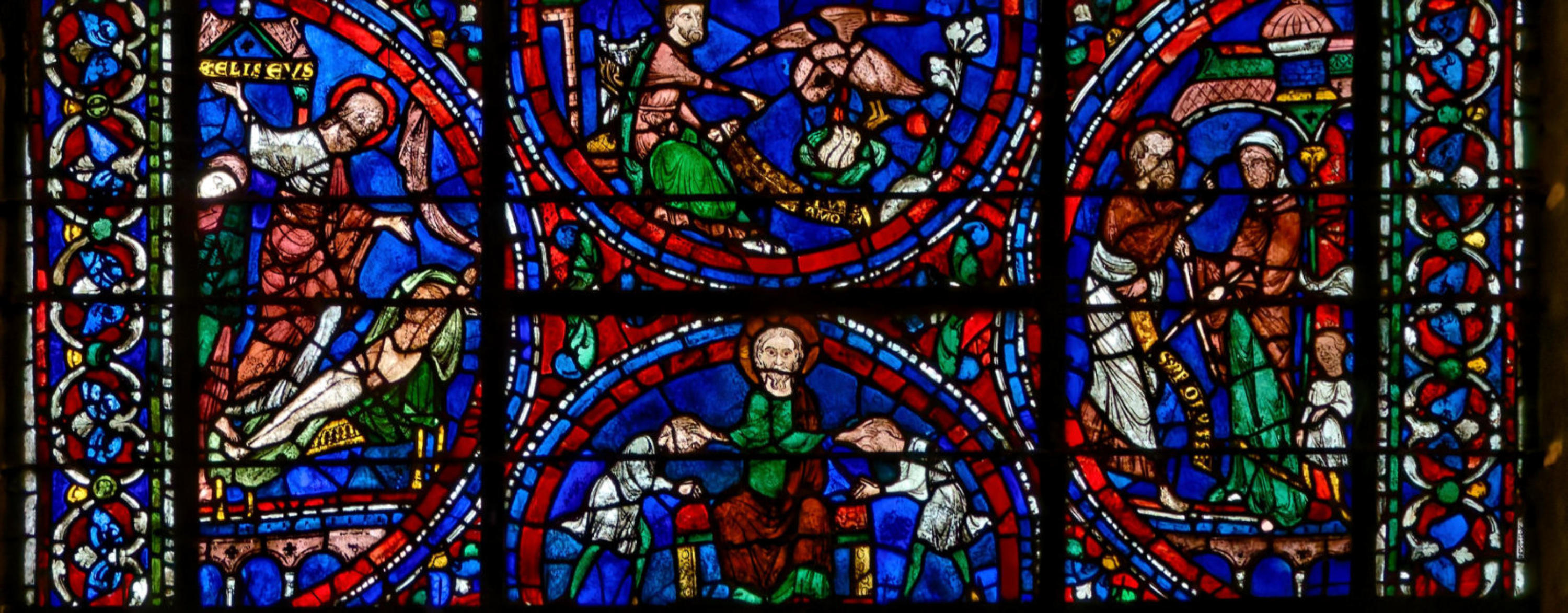 1205-1215 Chartres Cathédrale Notre-DameBaie 1312 lancettes En soubassement du Christ bénissant la croix, l’ange empêche Abraham de sacrifier Isaac (avec un bouc sur la scène) et sur l’autre lancette, la scène est répétée en grand