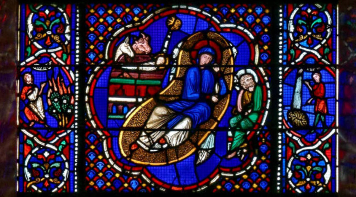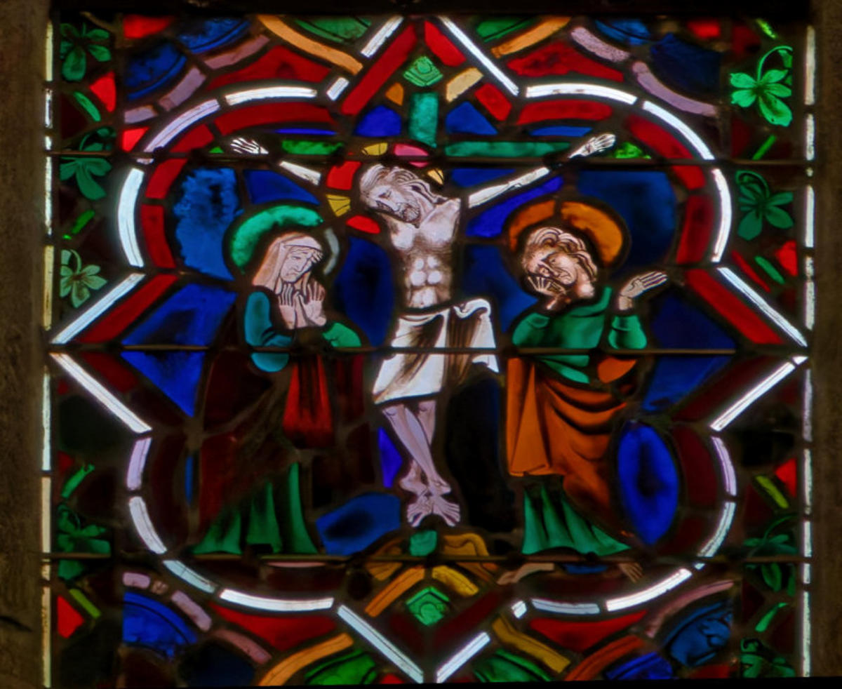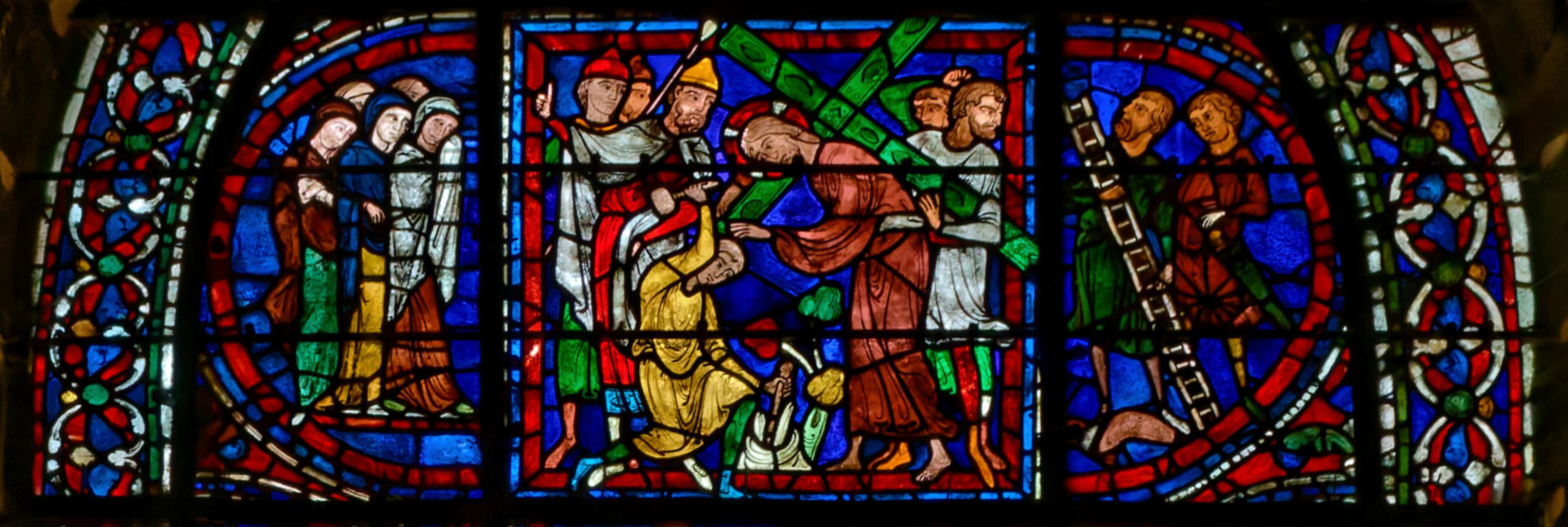 1235Le Mans (Sarthe) Cathédrale Saint-JulienBaie 0Verrière typologique de la PassionSous le portement de croix, Isaac porte le bois et l’ange entrave le bras d’Abraham (avec la présence d’un bouc)
