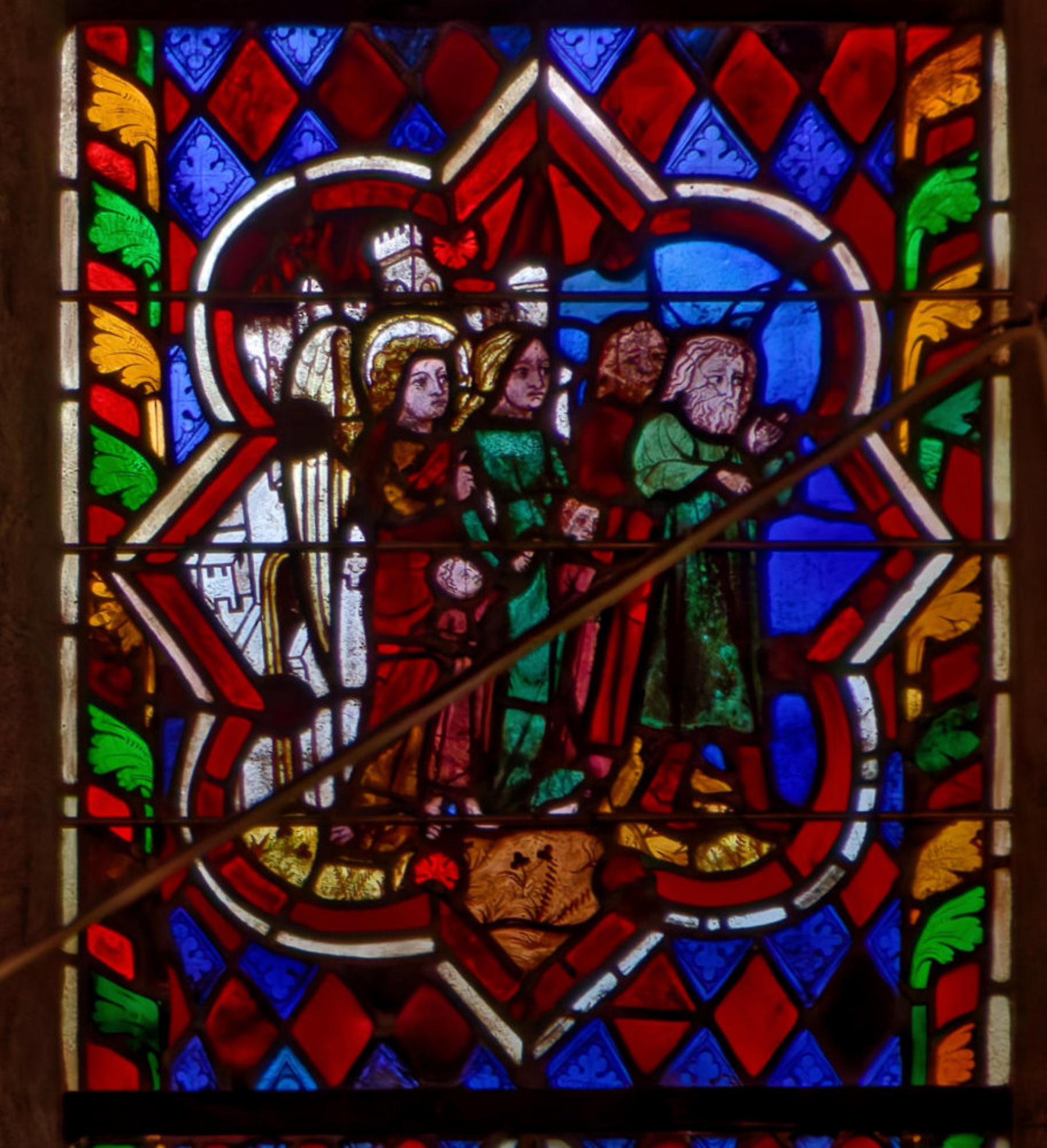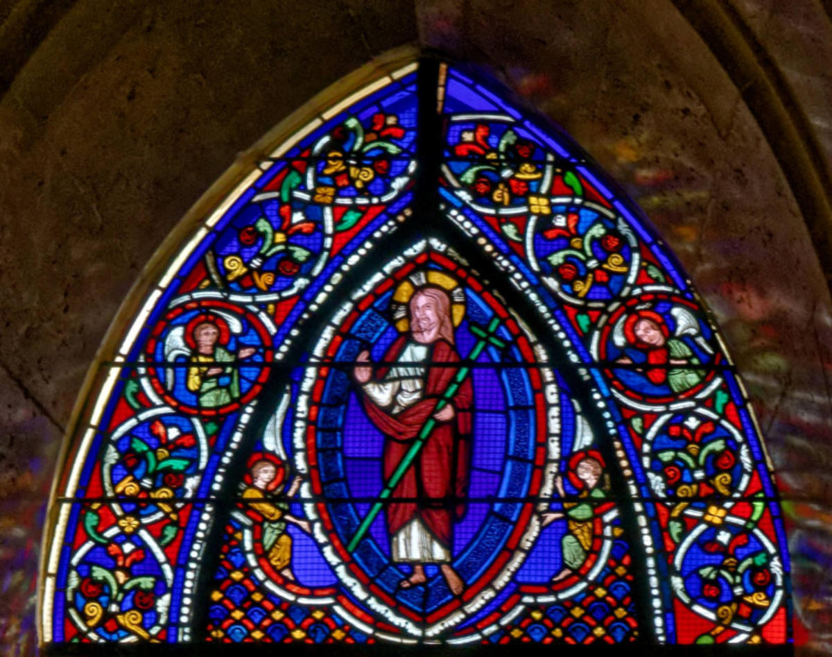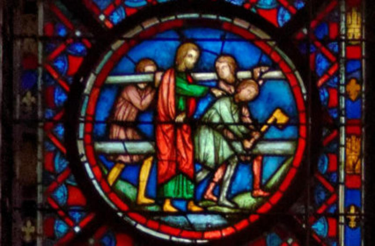 1235Le Mans (Sarthe) Cathédrale Saint-JulienBaie 0Verrière typologique de la PassionSous le portement de croix, Isaac porte le bois et l’ange entrave le bras d’Abraham (avec la présence d’un bouc)