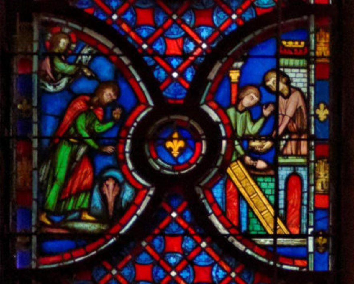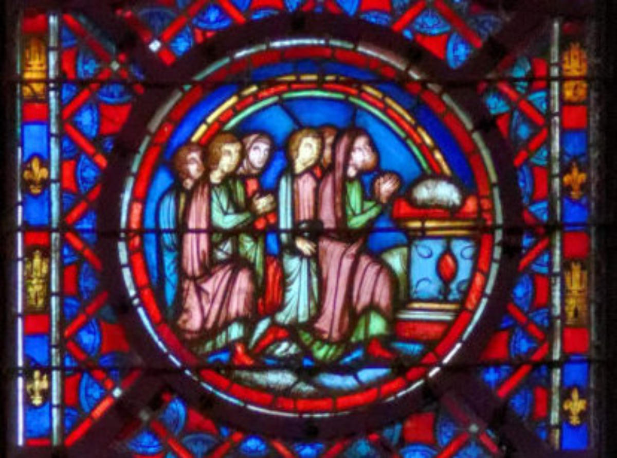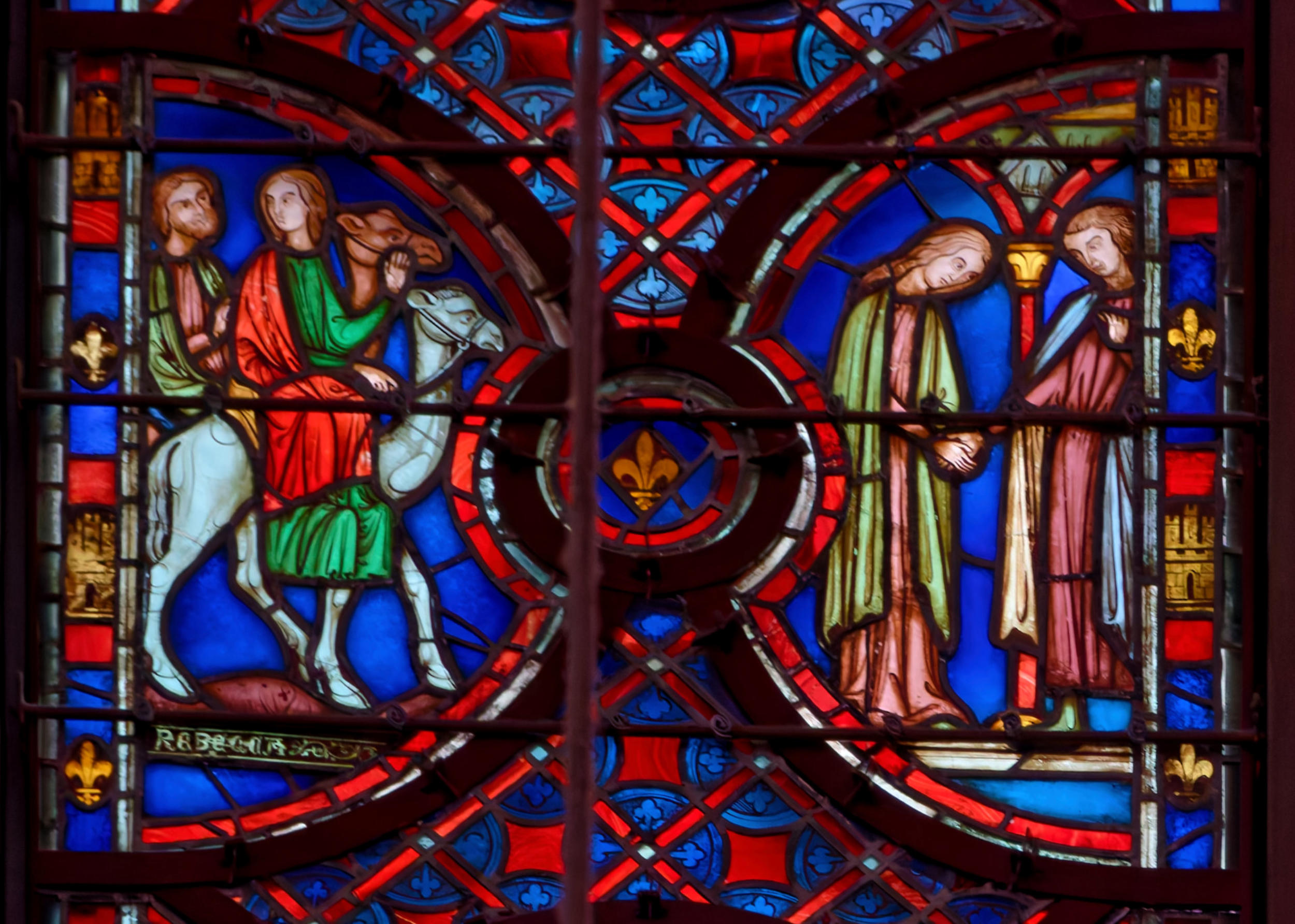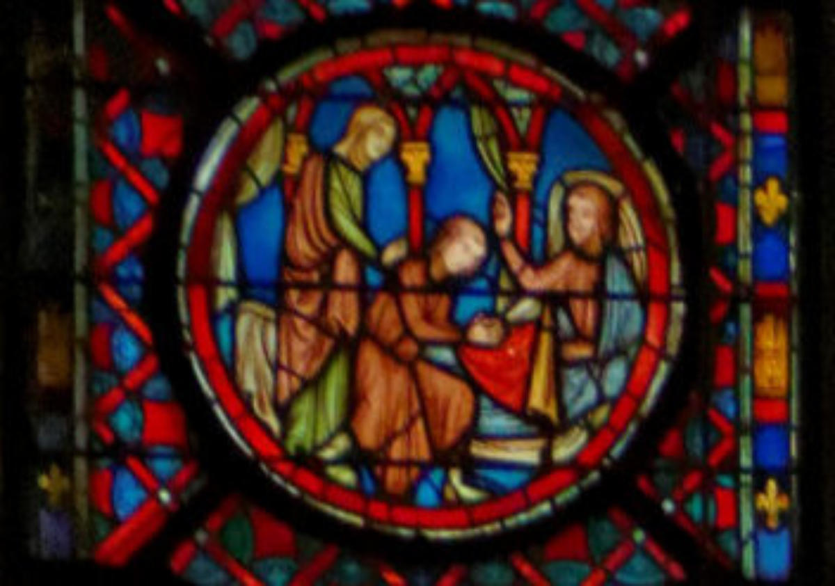 1242ParisSainte-ChapelleBaie 13La GenèsePromesse de Dieu à AbrahamAbraham élève un autel Abraham vainqueur des ÉlamitesMelchisédech offre le pain et le vin à AbrahamScène de double circoncisionLes trois anges apparaissent à AbrahamL’ange ordonne à Loth de partir pour SodomeFuite de LothDestruction de SodomeSara présente Isaac nouveau-né à AbrahamAgar chassée par AbrahamAgar dans le désert, visitée par un angeAbraham et Isaac montent vers le lieu du sacrificeSacrifice d’IsaacMort de SaraAbraham achète le champ d’ÉphronAbraham envoie Éliézer en voyageÉliézer, serviteur d’Abraham, rencontre RébeccaÉliézer donne des bijoux à RébeccaÉliézer demande Rébecca en mariage pour Isaac Éliézer ramène RébeccaMariage d’Isaac et de RébeccaAbraham enseveli par ses filsNaissance d’Ésaü et de JacobLes vitraux initiaux datent de 1242 et tous les vitraux mentionnés ci-dessus datent de la restauration de 1848 sous la forme de pastiches : Louis Grodecki pense que le programme iconographique devait être encore plus riche à l’origine en se fondant sur ce l’on trouvait sur des vitraux réalisés avant 1242 (voir ci-dessus)
