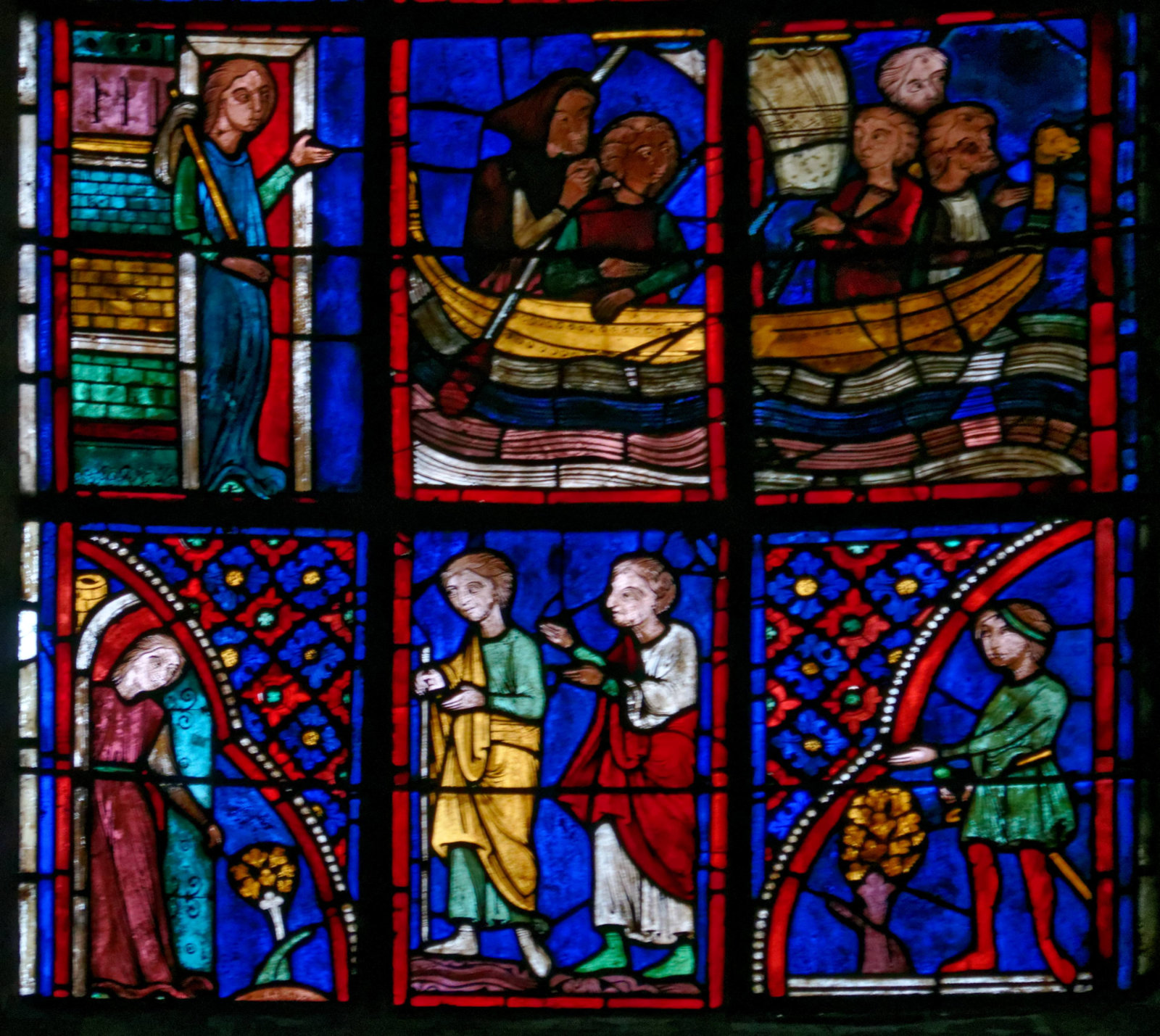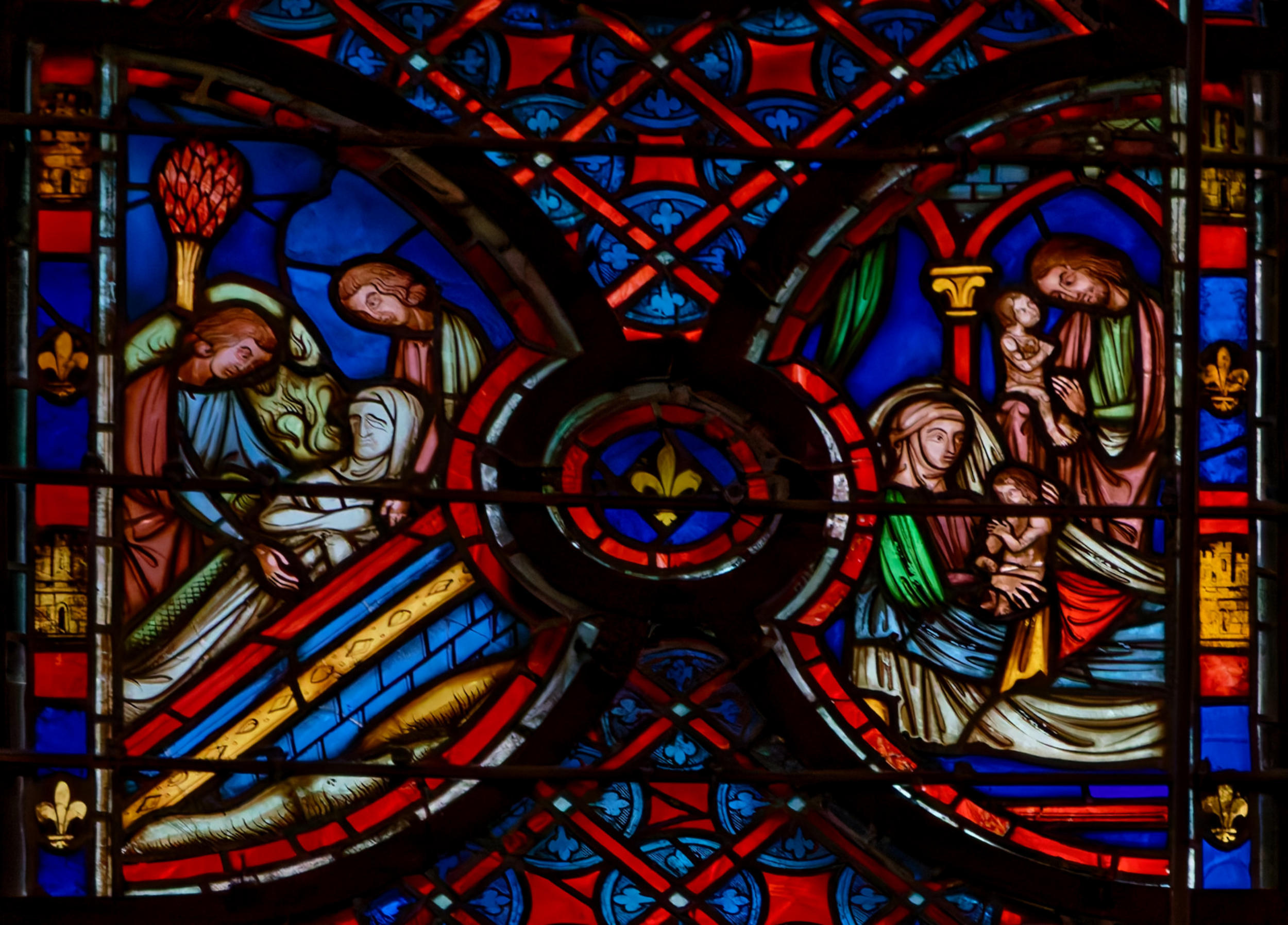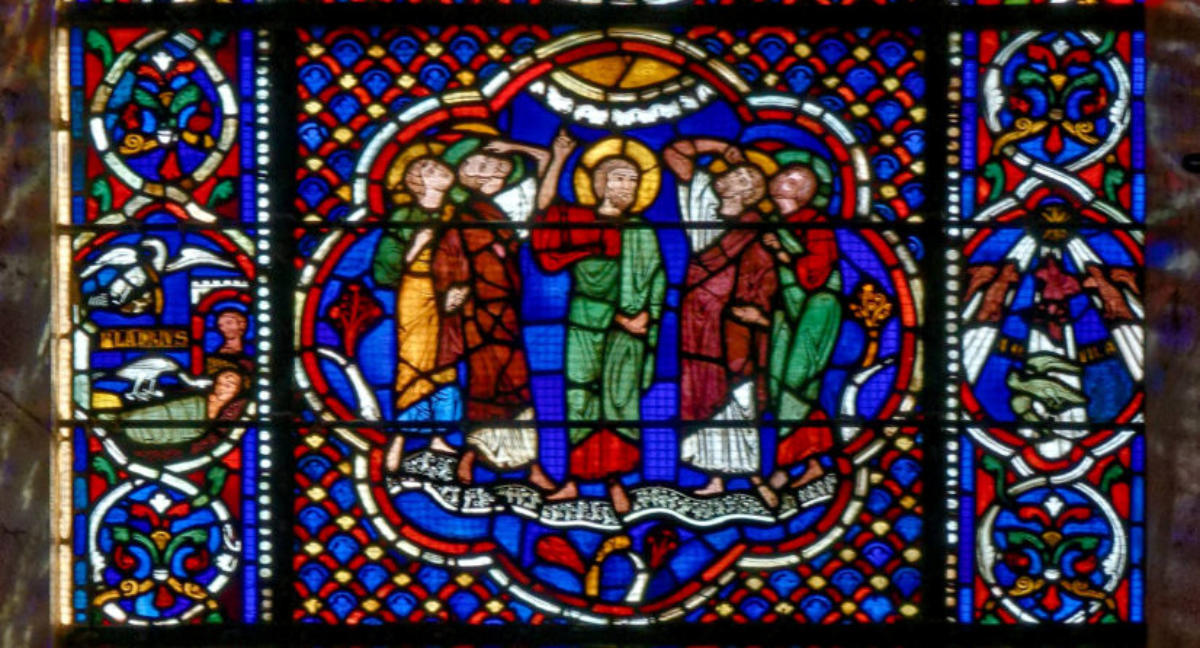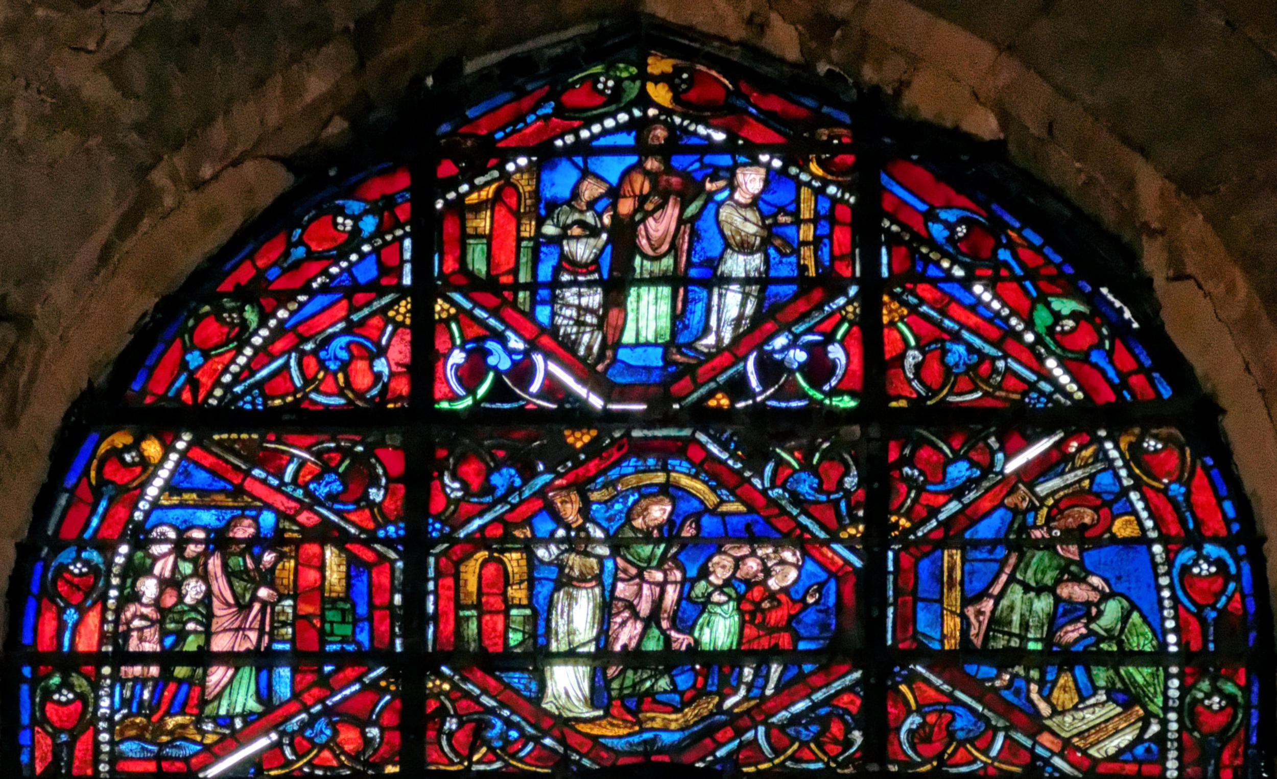 1242ParisSainte-ChapelleBaie 13La GenèsePromesse de Dieu à AbrahamAbraham élève un autel Abraham vainqueur des ÉlamitesMelchisédech offre le pain et le vin à AbrahamScène de double circoncisionLes trois anges apparaissent à AbrahamL’ange ordonne à Loth de partir pour SodomeFuite de LothDestruction de SodomeSara présente Isaac nouveau-né à AbrahamAgar chassée par AbrahamAgar dans le désert, visitée par un angeAbraham et Isaac montent vers le lieu du sacrificeSacrifice d’IsaacMort de SaraAbraham achète le champ d’ÉphronAbraham envoie Éliézer en voyageÉliézer, serviteur d’Abraham, rencontre RébeccaÉliézer donne des bijoux à RébeccaÉliézer demande Rébecca en mariage pour Isaac Éliézer ramène RébeccaMariage d’Isaac et de RébeccaAbraham enseveli par ses filsNaissance d’Ésaü et de JacobLes vitraux initiaux datent de 1242 et tous les vitraux mentionnés ci-dessus datent de la restauration de 1848 sous la forme de pastiches : Louis Grodecki pense que le programme iconographique devait être encore plus riche à l’origine en se fondant sur ce l’on trouvait sur des vitraux réalisés avant 1242 (voir ci-dessus)