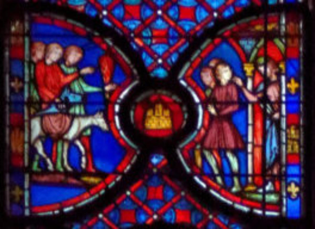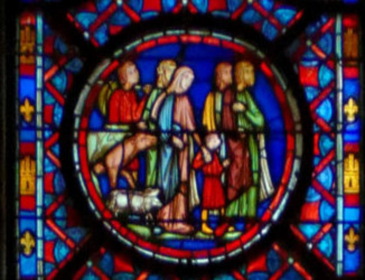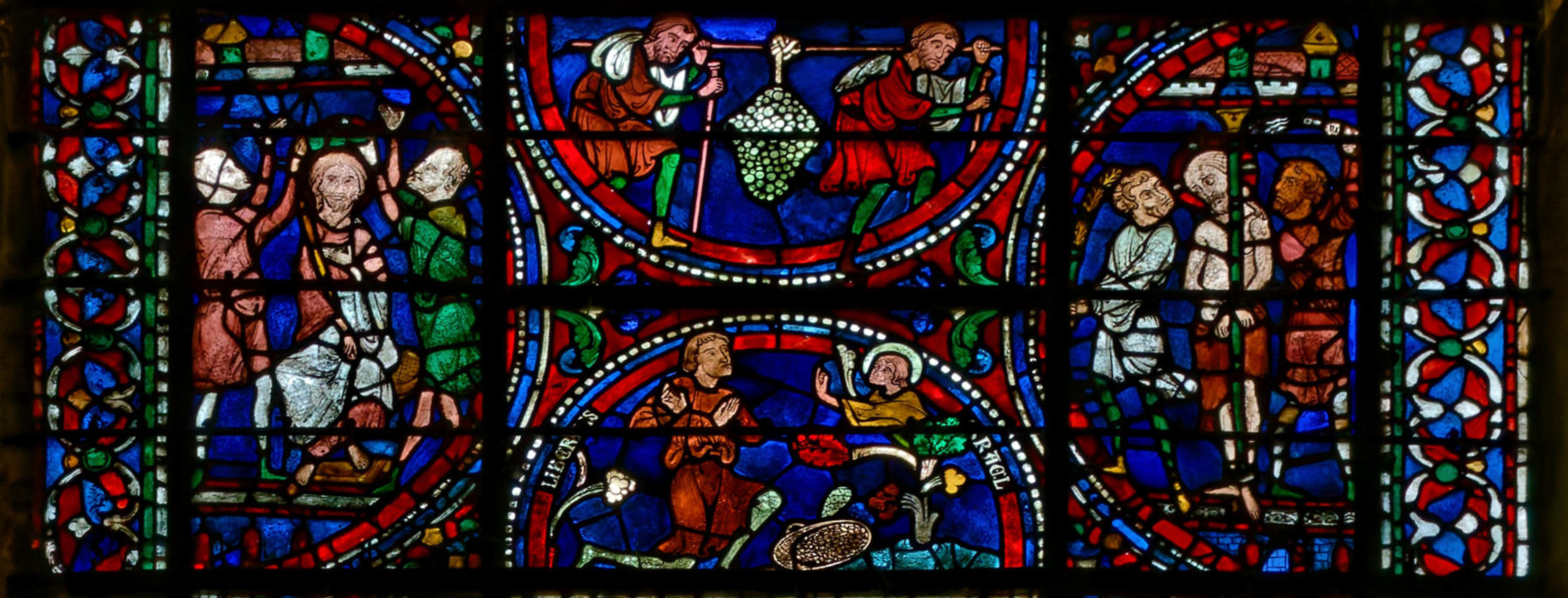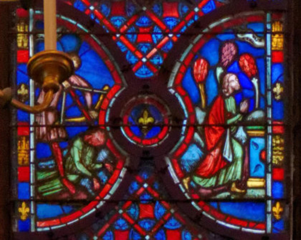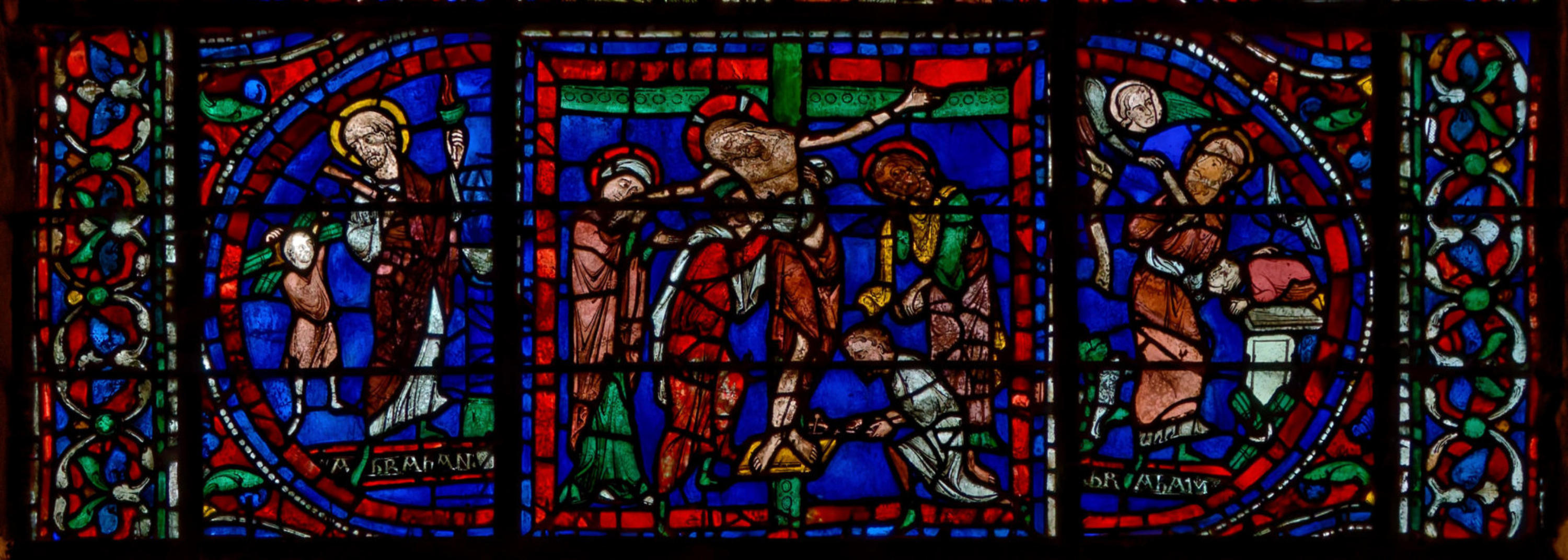 1205-1215 Chartres Cathédrale Notre-DameBaie 37 Vitrail symbolique de la Passion2 médaillonsAbraham se tourne vers Isaac qui porte le bois du sacrifice (Déposition de croix)L'ange retient le bras d'Abraham