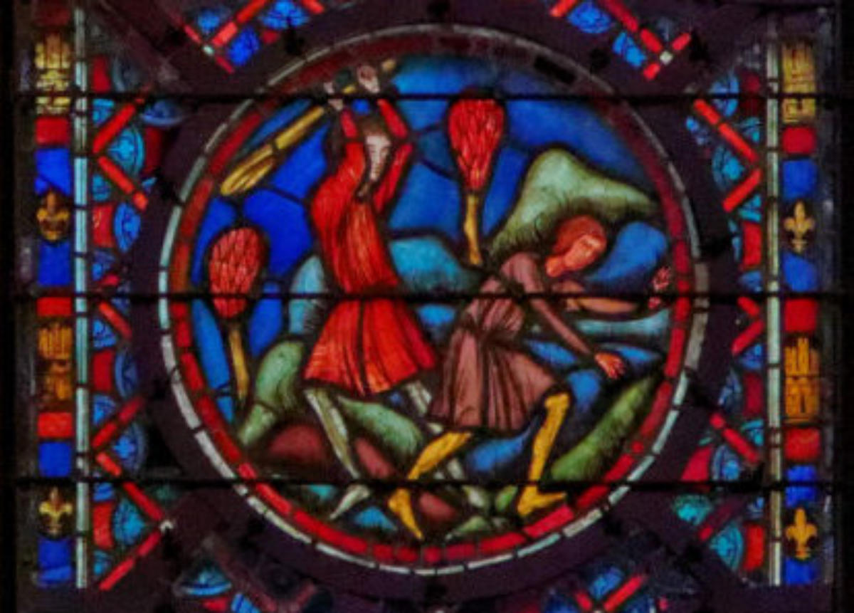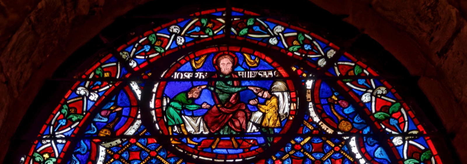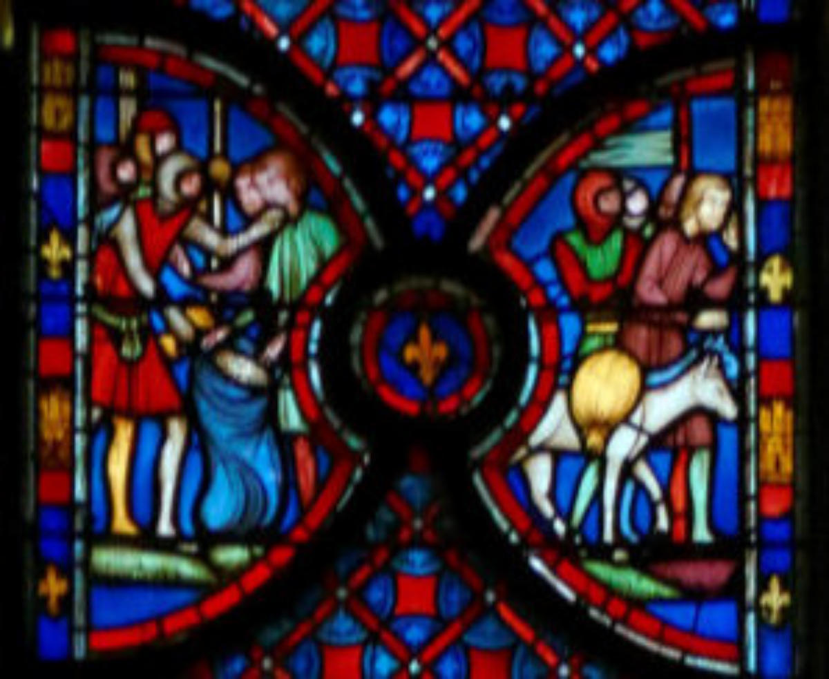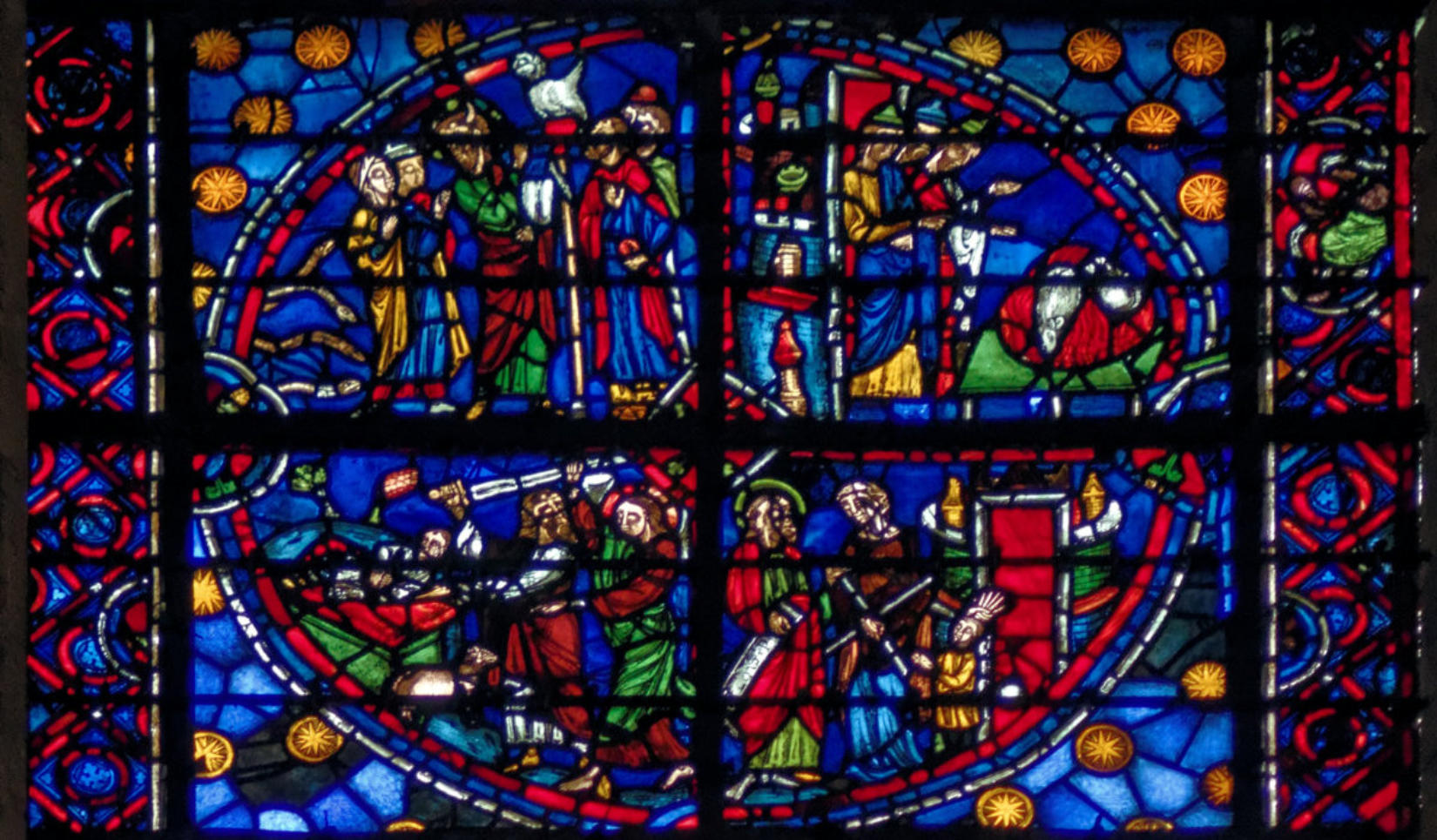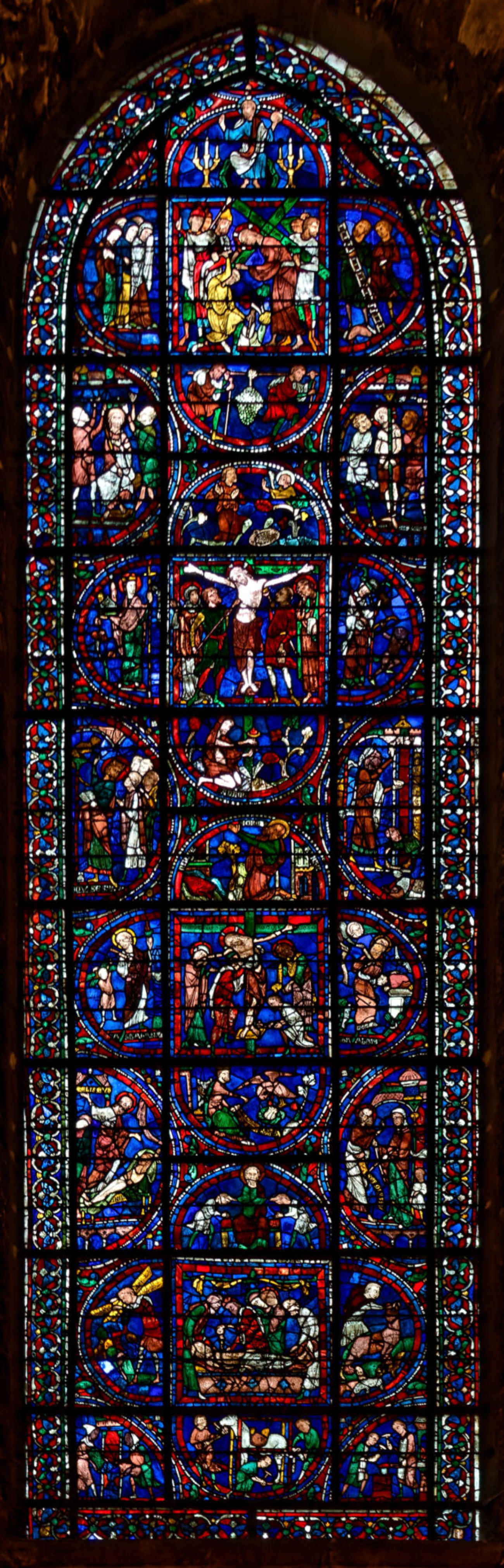 1205-1215 Chartres Cathédrale Notre-DameBaie 37 Vitrail symbolique de la Passion2 médaillonsAbraham se tourne vers Isaac qui porte le bois du sacrifice (Déposition de croix)L'ange retient le bras d'Abraham