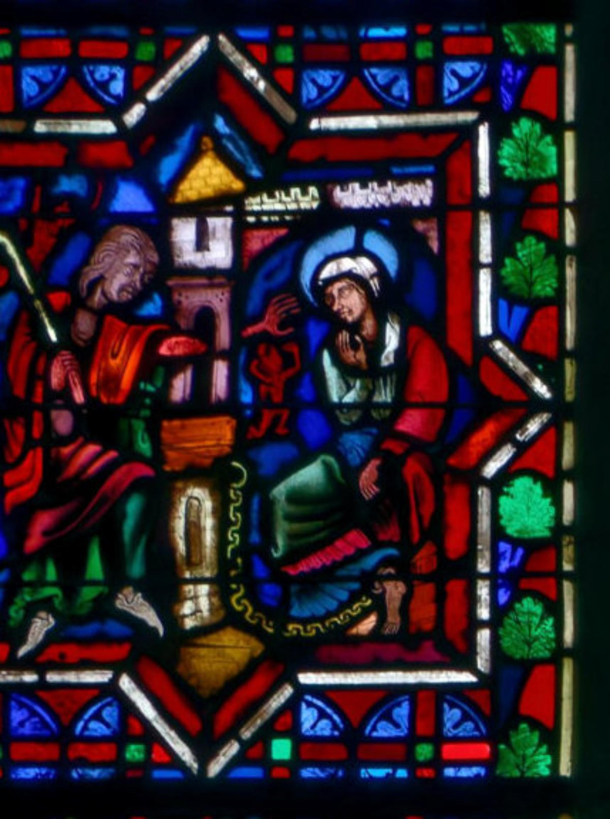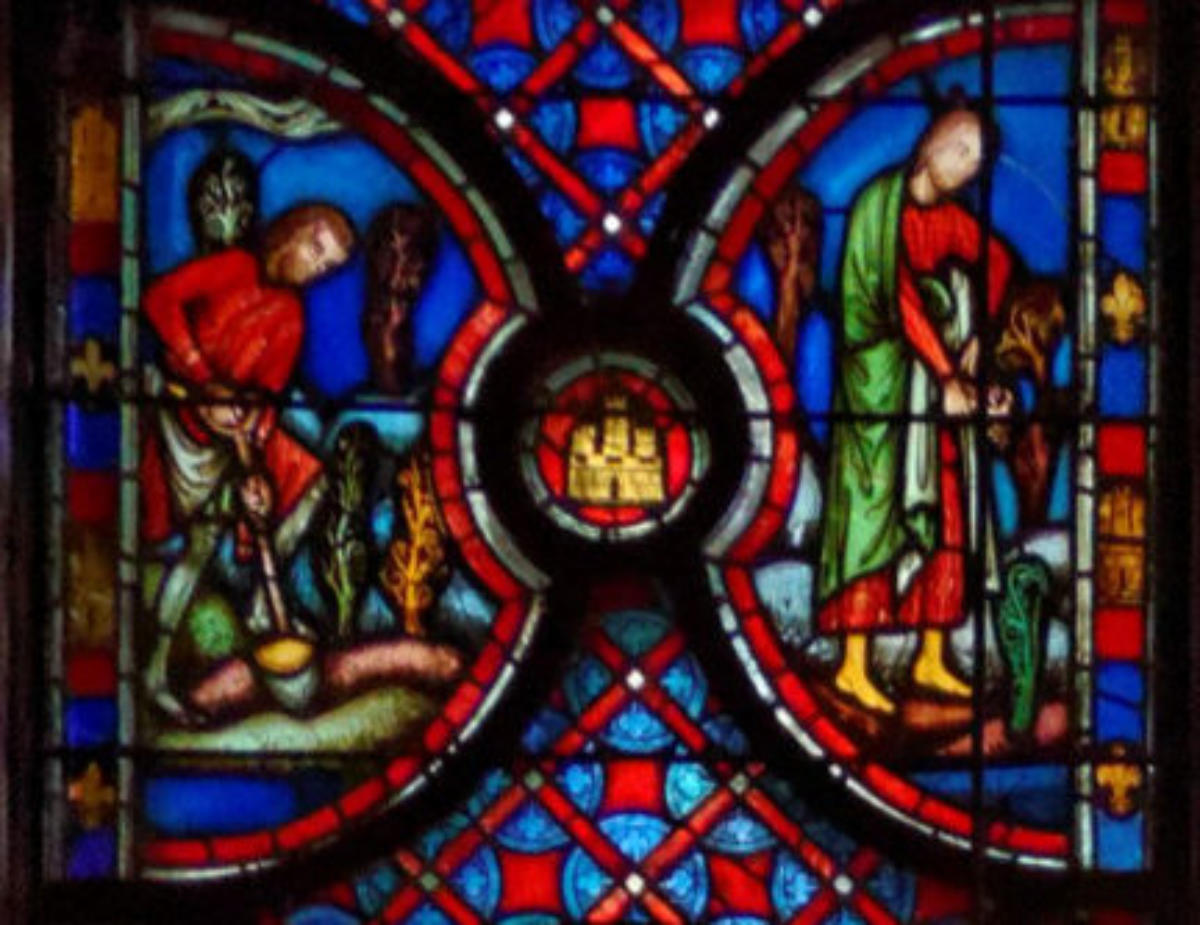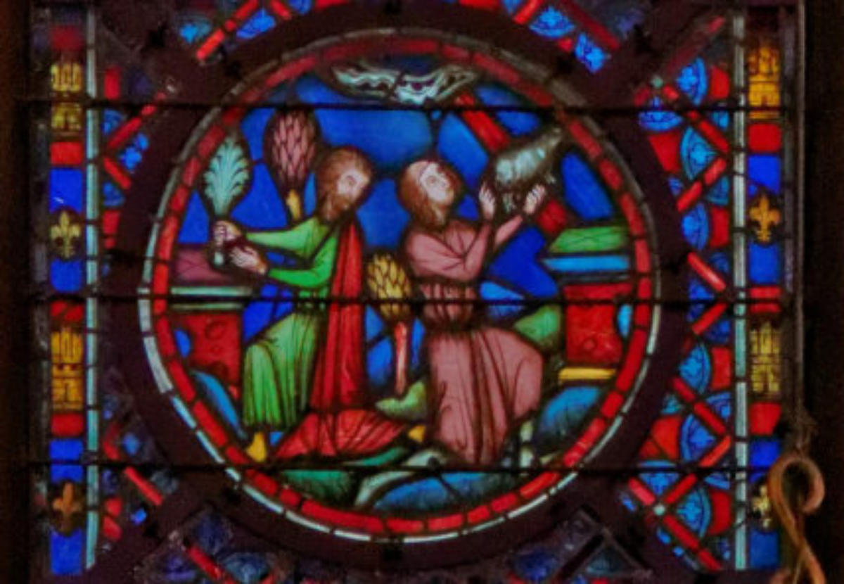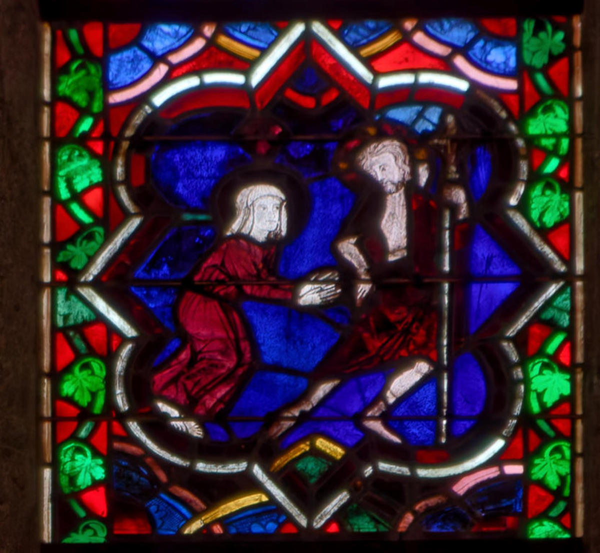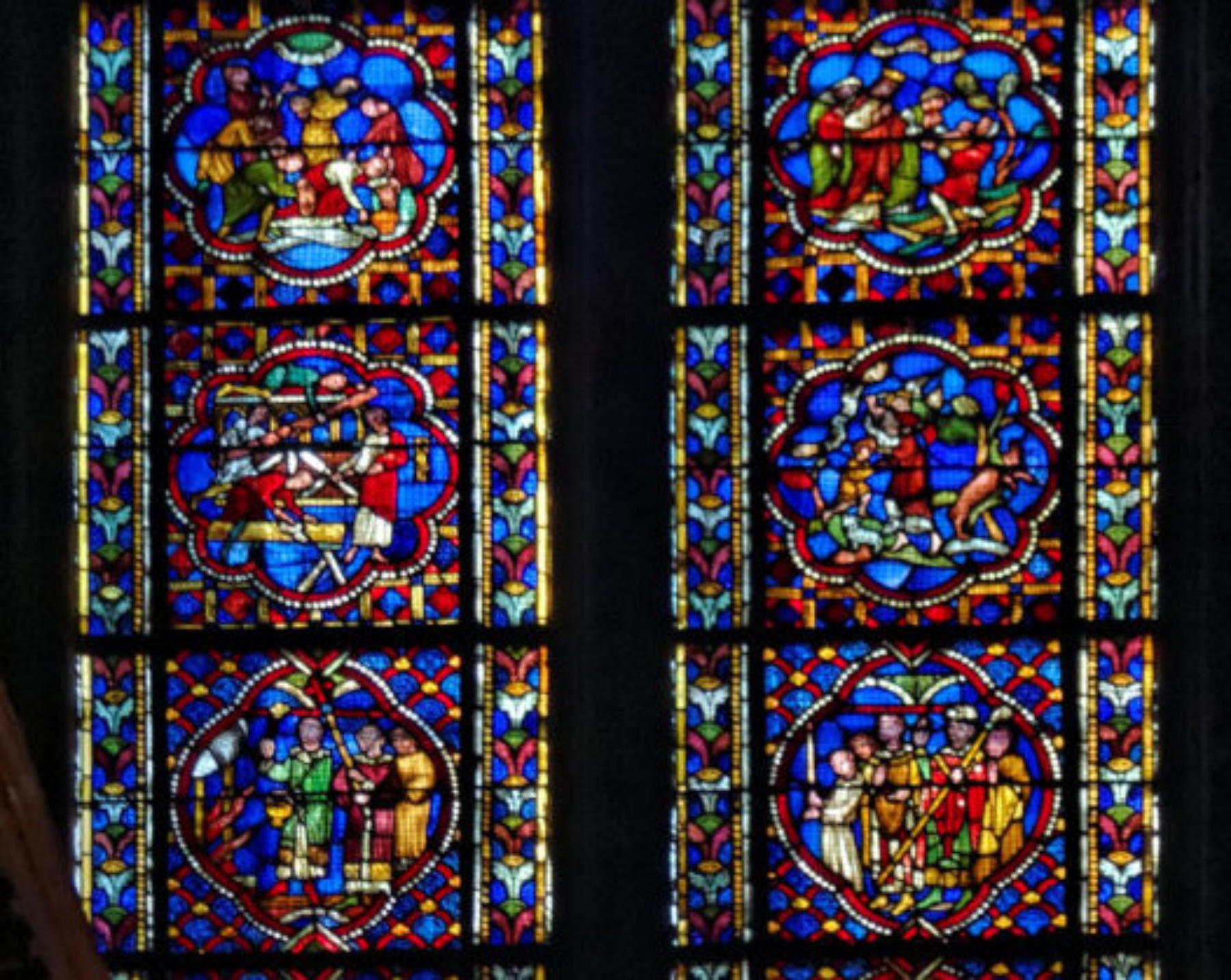 1205-1215 Chartres Cathédrale Notre-DameBaie 37 Vitrail symbolique de la Passion2 médaillonsAbraham se tourne vers Isaac qui porte le bois du sacrifice (Déposition de croix)L'ange retient le bras d'Abraham