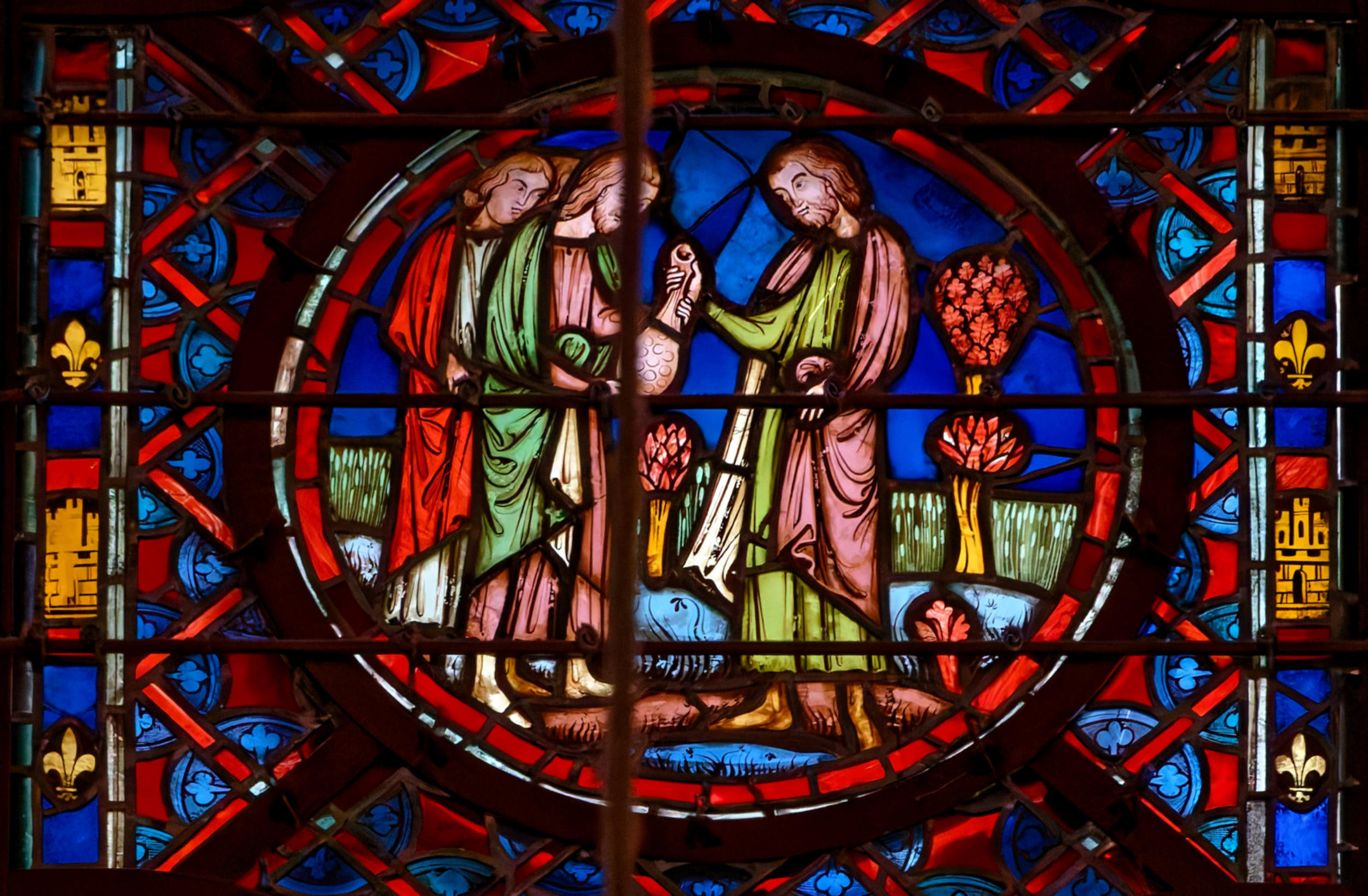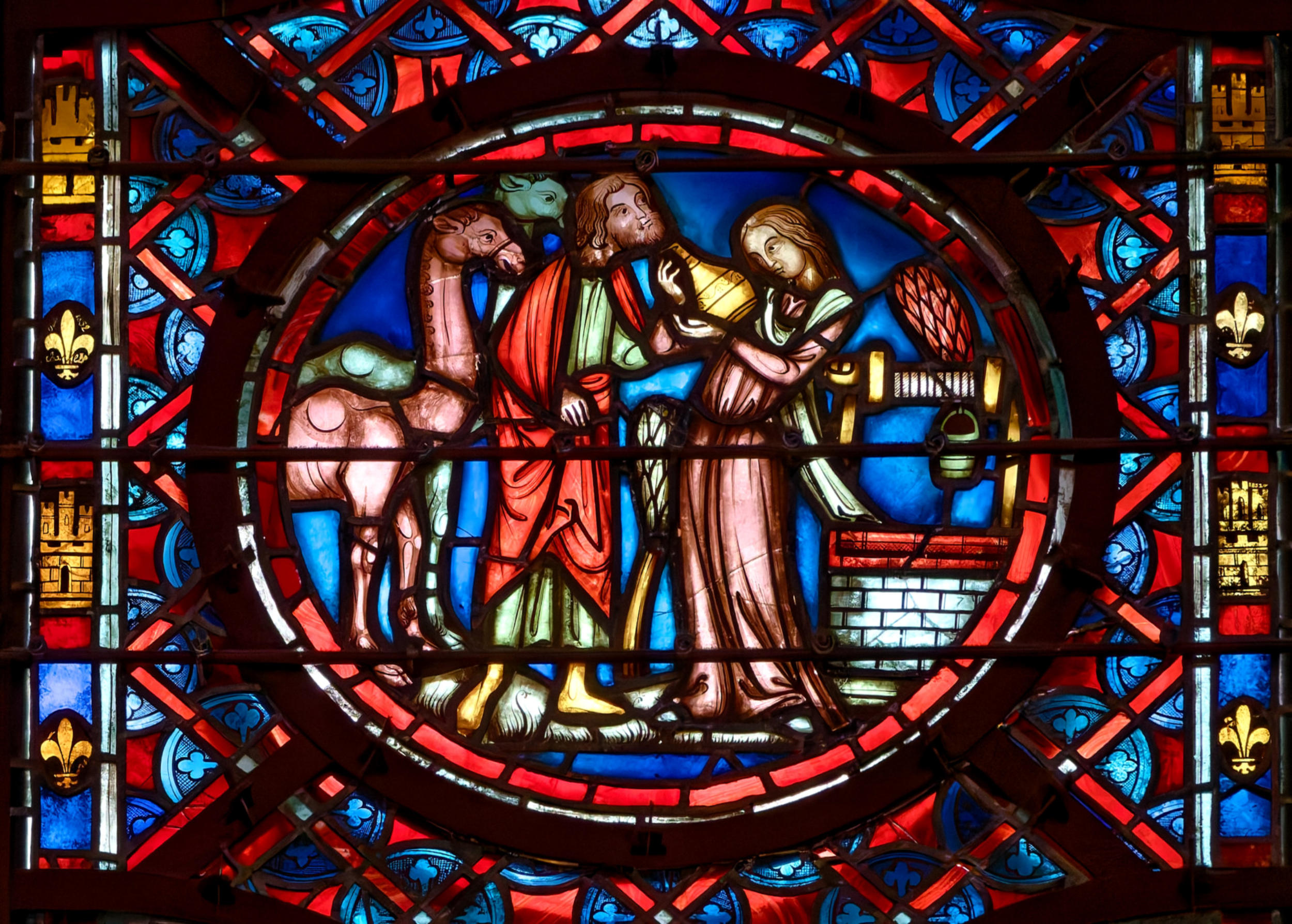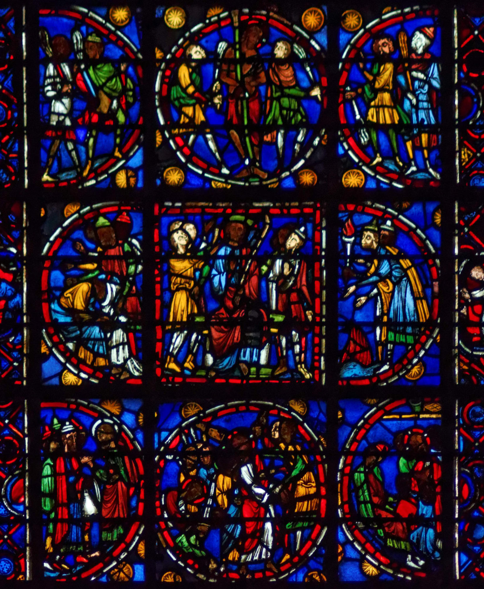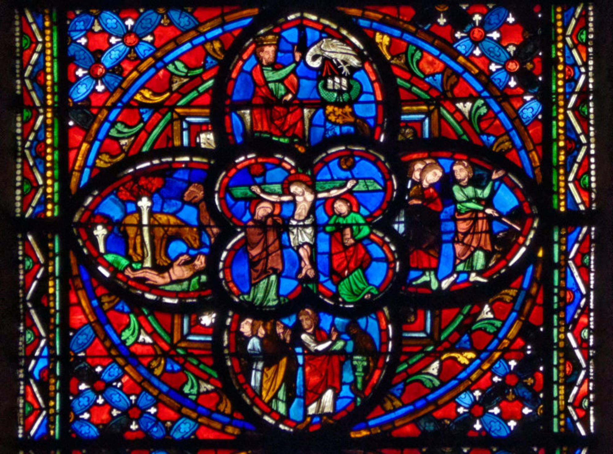 1205-1215 Chartres Cathédrale Notre-DameBaie 37 Vitrail symbolique de la Passion2 médaillonsAbraham se tourne vers Isaac qui porte le bois du sacrifice (Déposition de croix)L'ange retient le bras d'Abraham