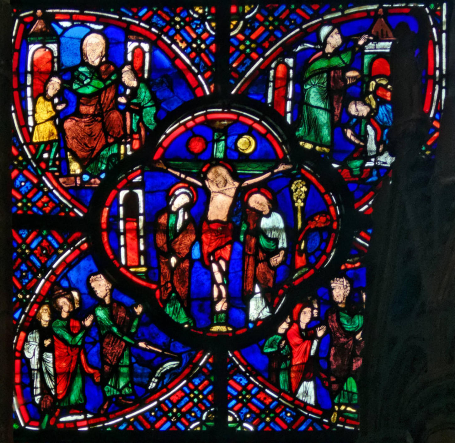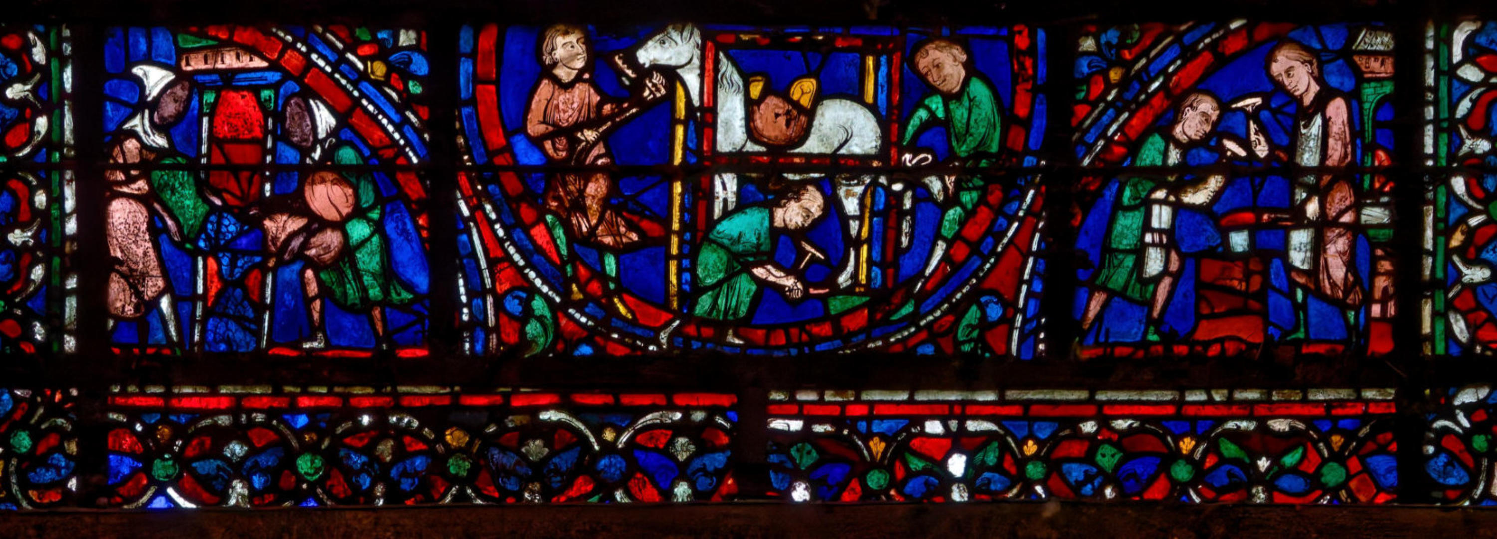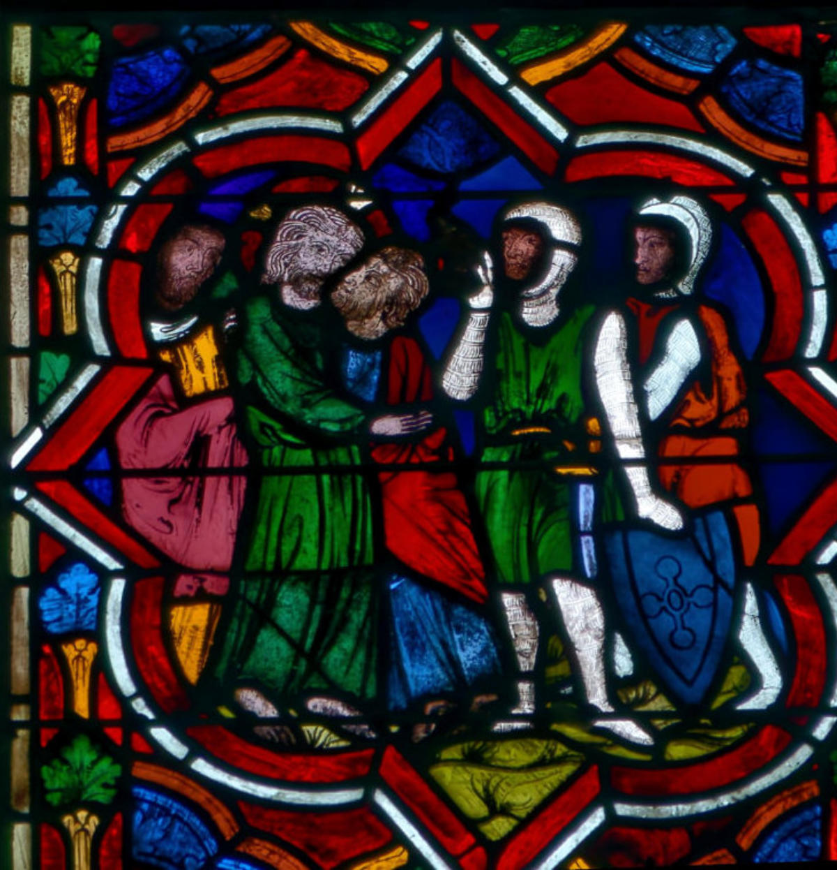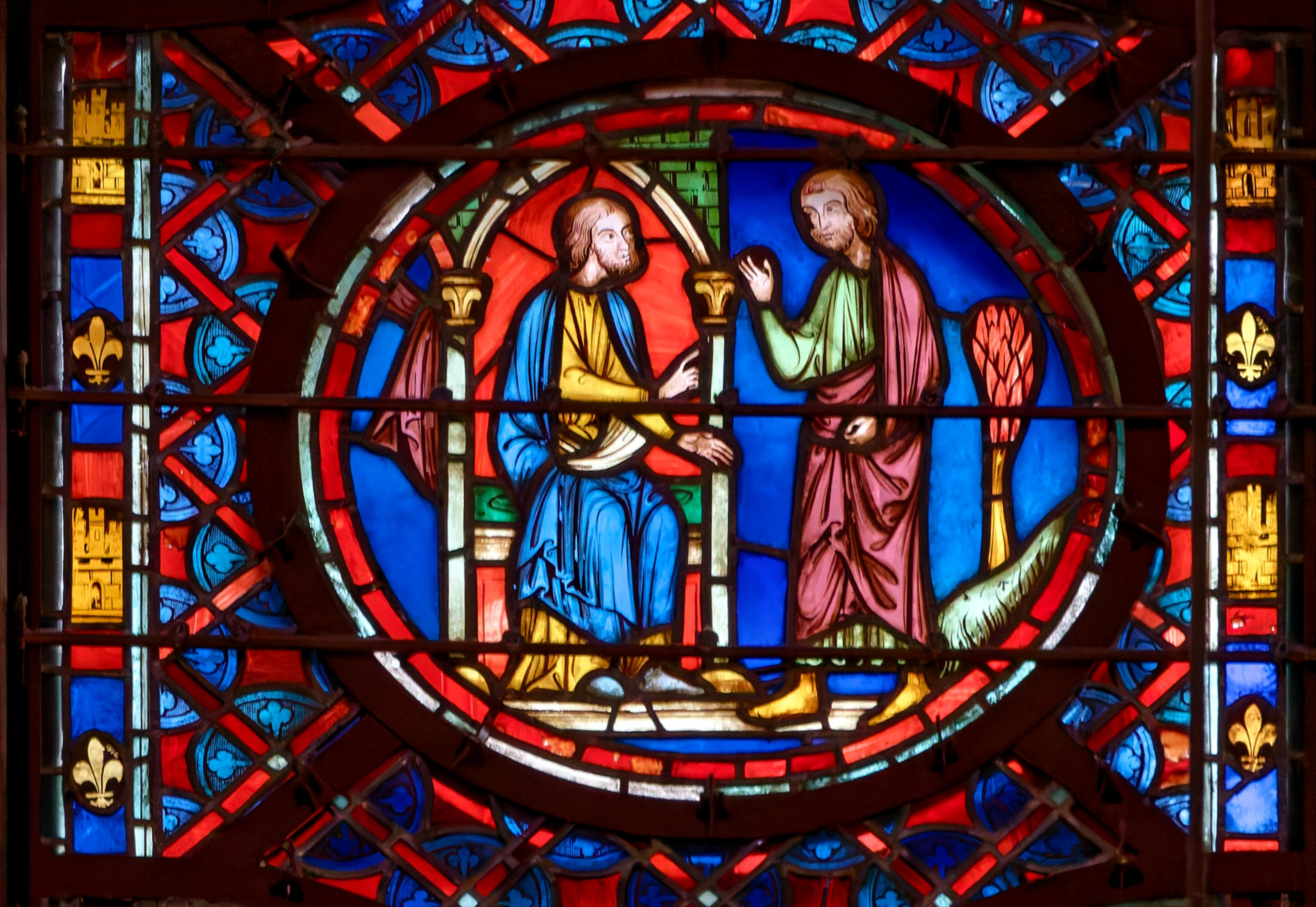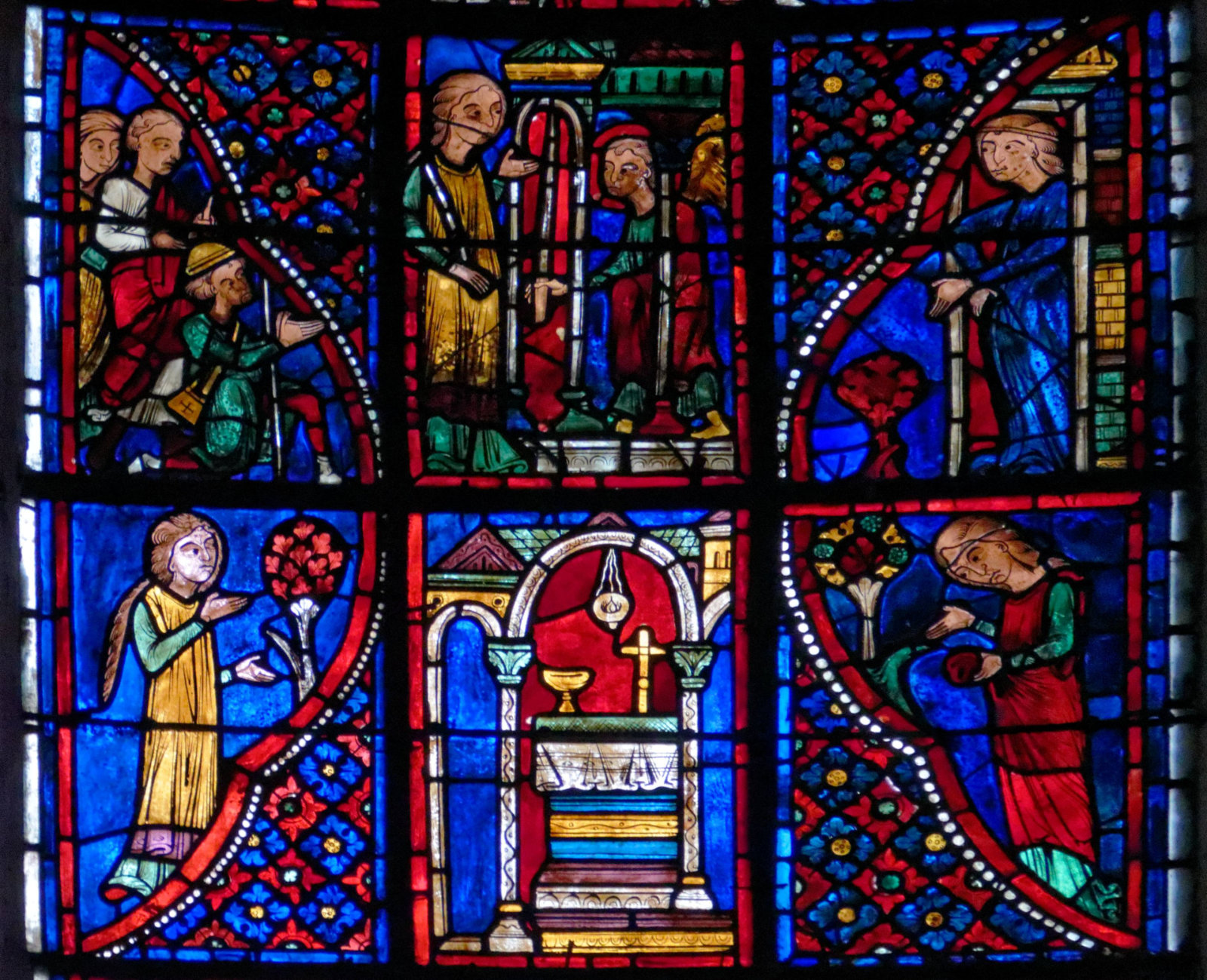 1205-1215 Chartres Cathédrale Notre-DameBaie 37 Vitrail symbolique de la Passion2 médaillonsAbraham se tourne vers Isaac qui porte le bois du sacrifice (Déposition de croix)L'ange retient le bras d'Abraham