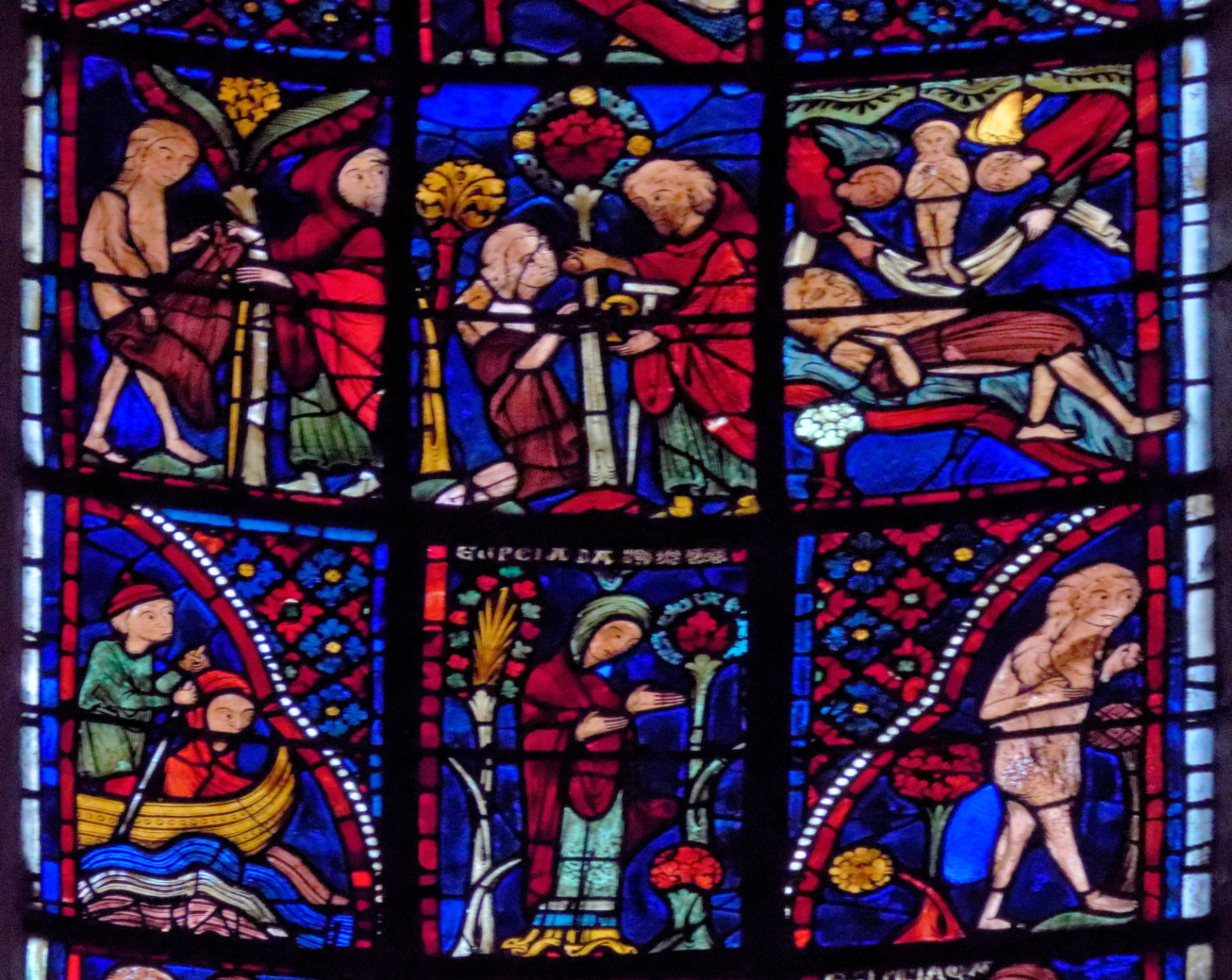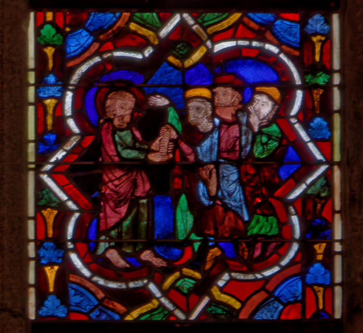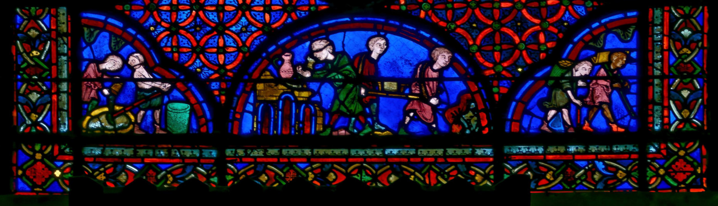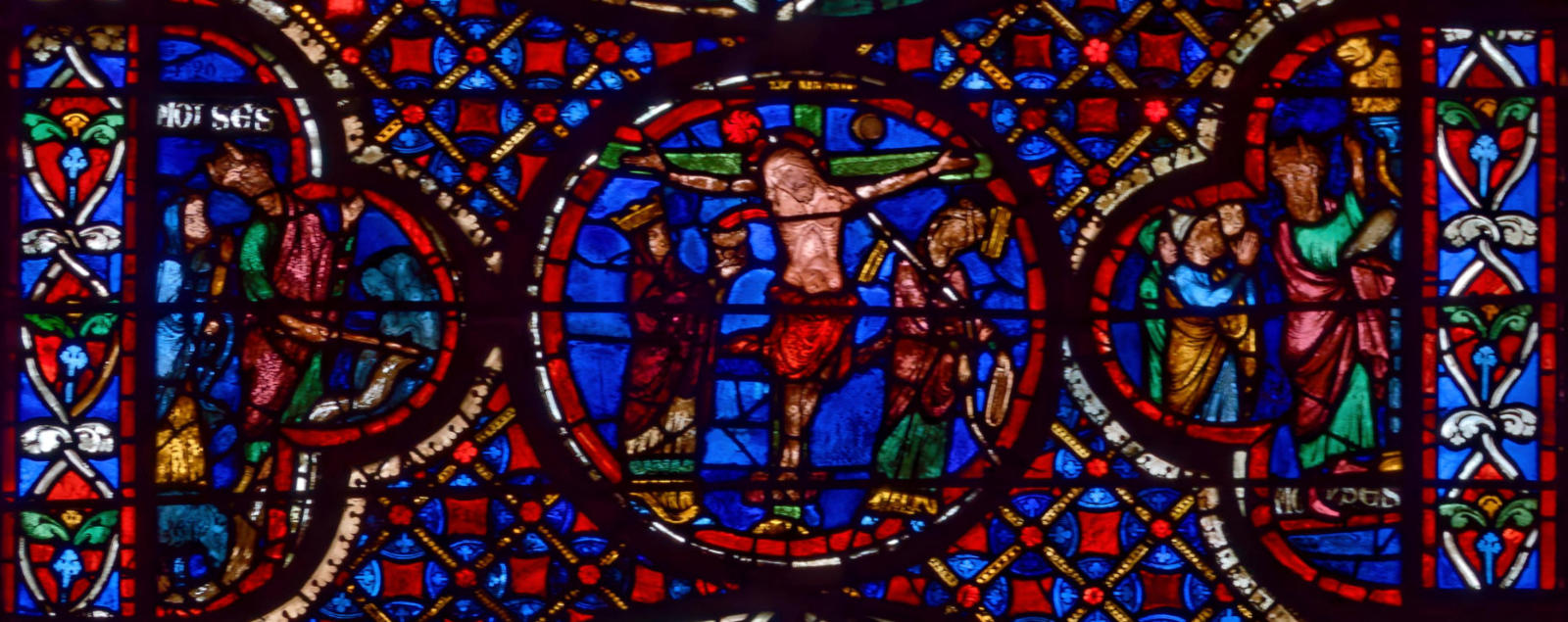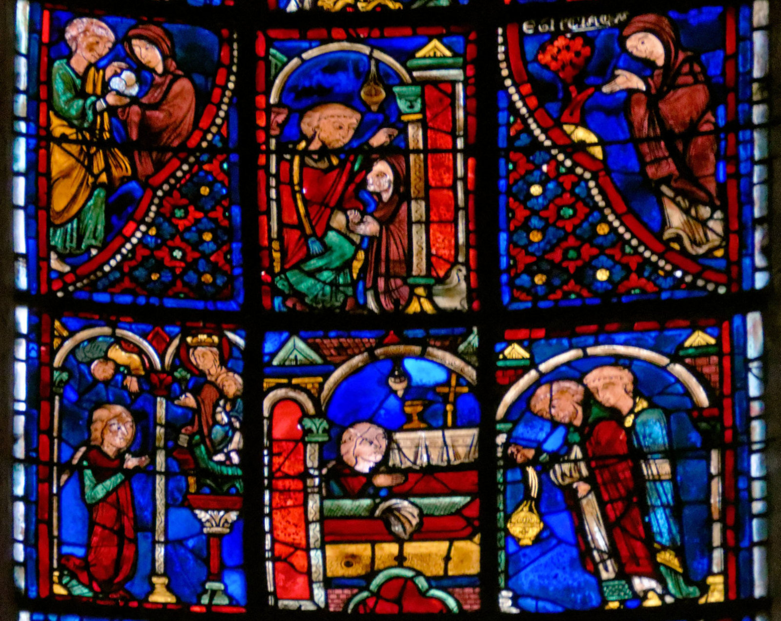 1205-1215 Chartres Cathédrale Notre-DameBaie 37 Vitrail symbolique de la Passion2 médaillonsAbraham se tourne vers Isaac qui porte le bois du sacrifice (Déposition de croix)L'ange retient le bras d'Abraham
