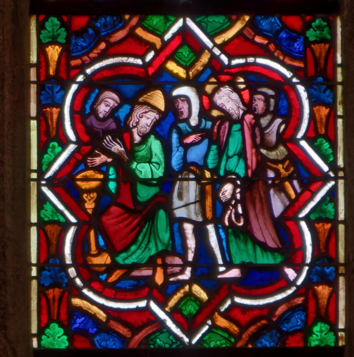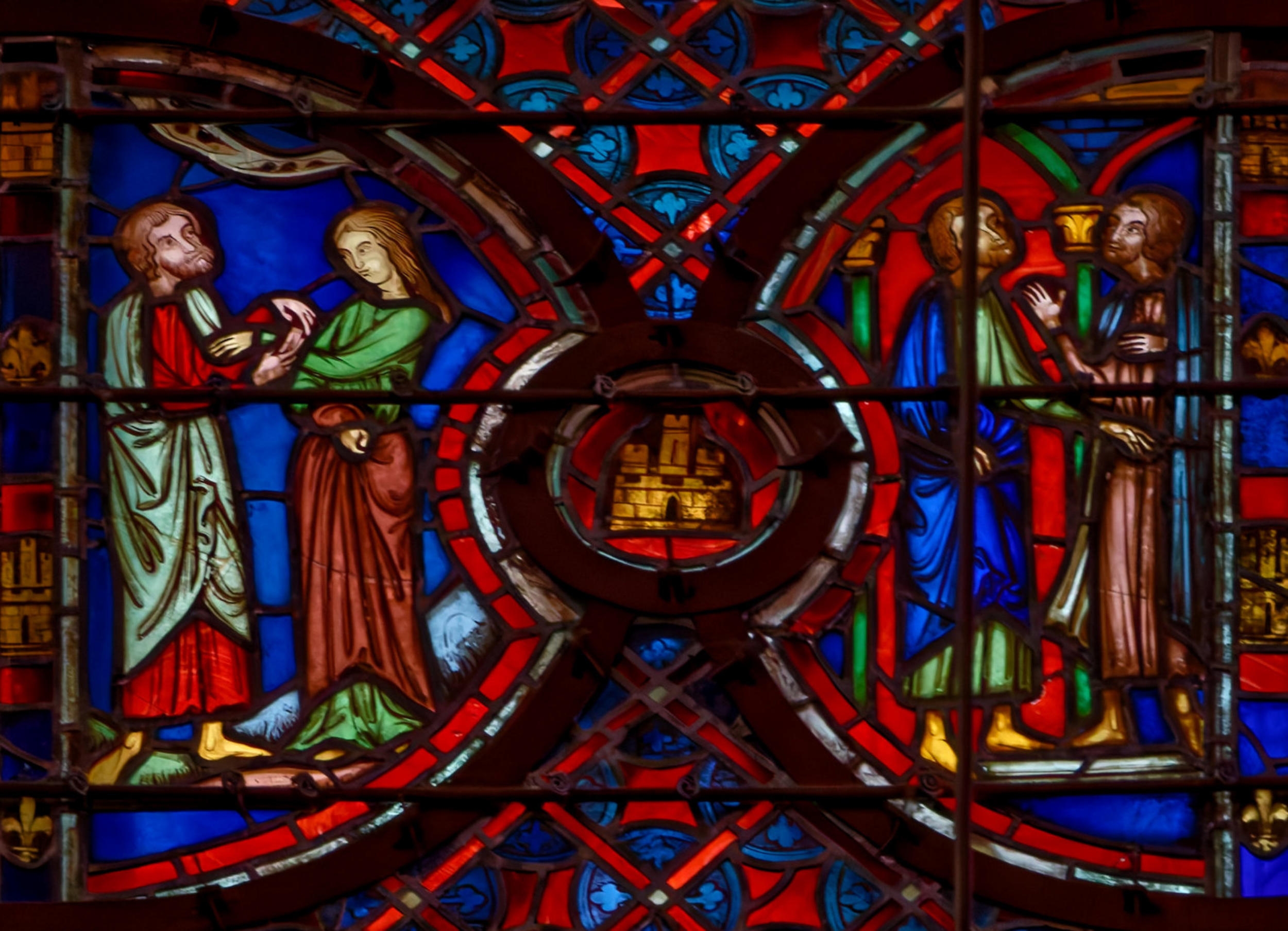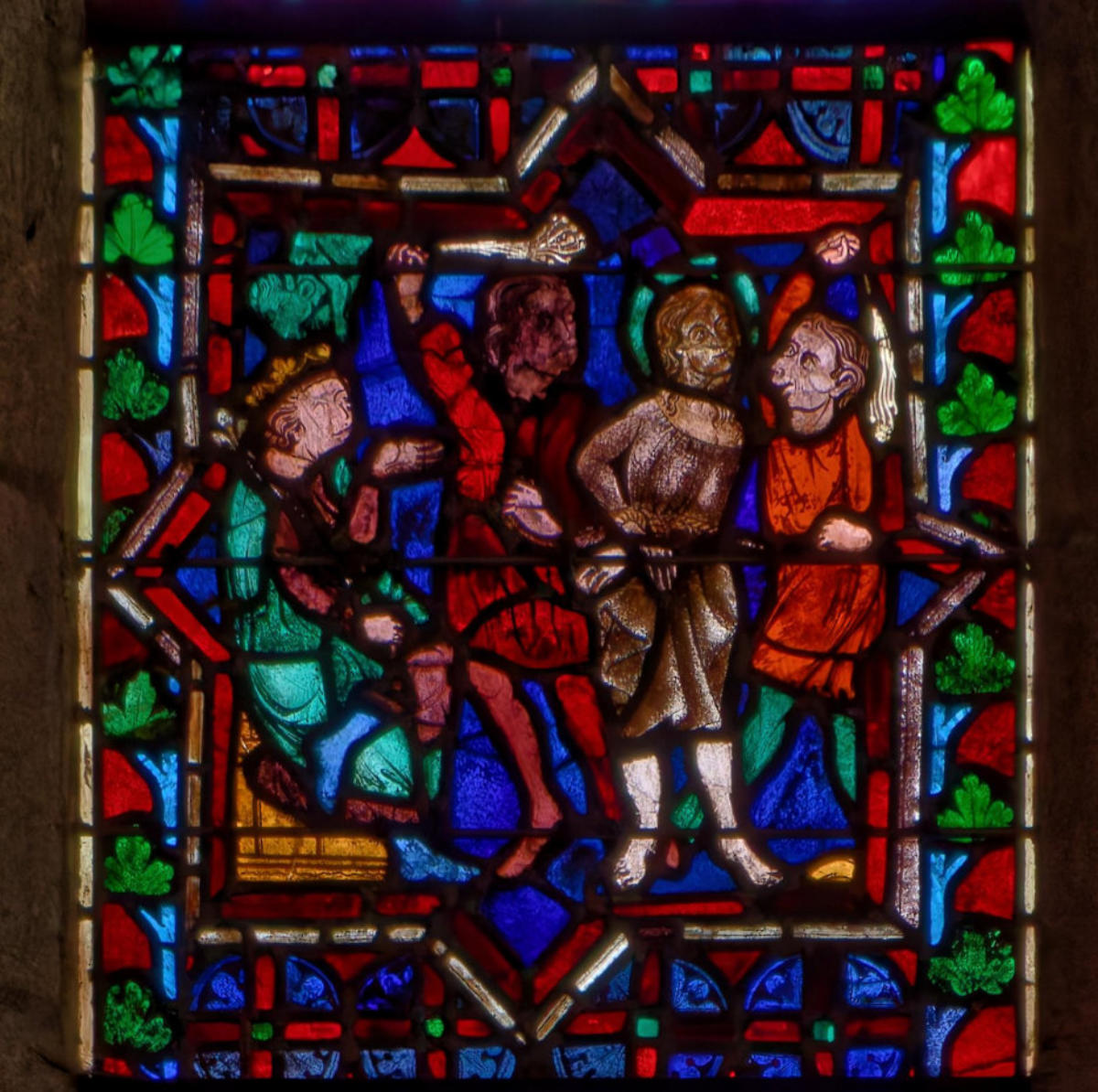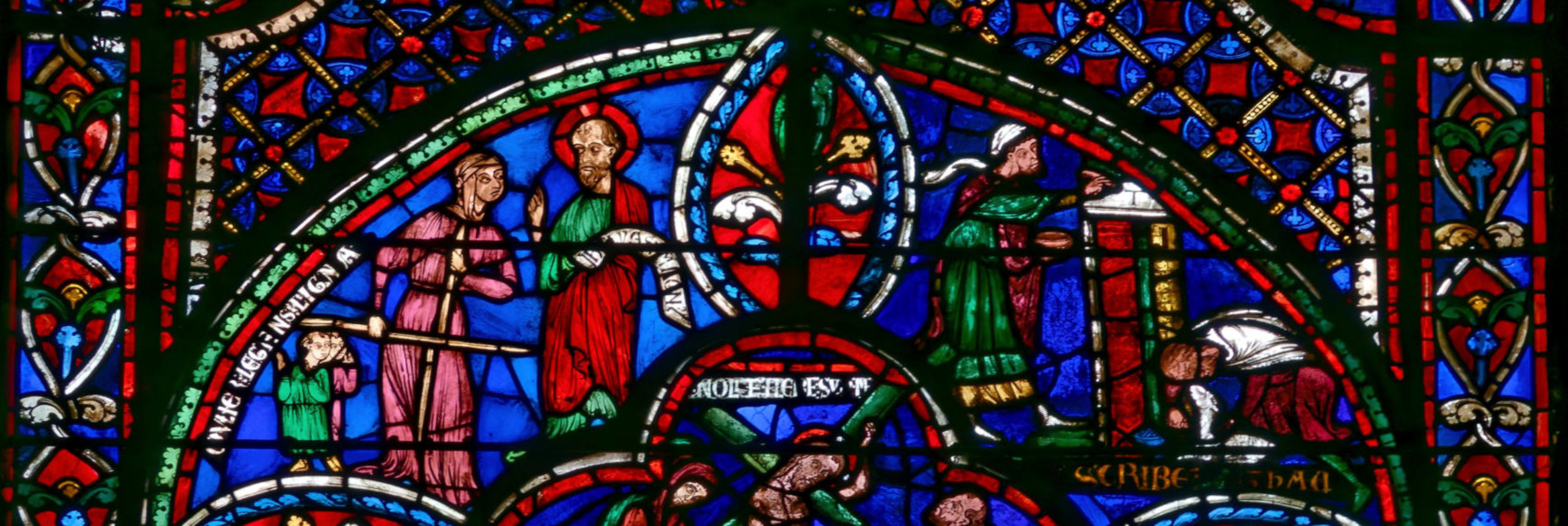 1205-1215 Chartres Cathédrale Notre-DameBaie 37 Vitrail symbolique de la Passion2 médaillonsAbraham se tourne vers Isaac qui porte le bois du sacrifice (Déposition de croix)L'ange retient le bras d'Abraham