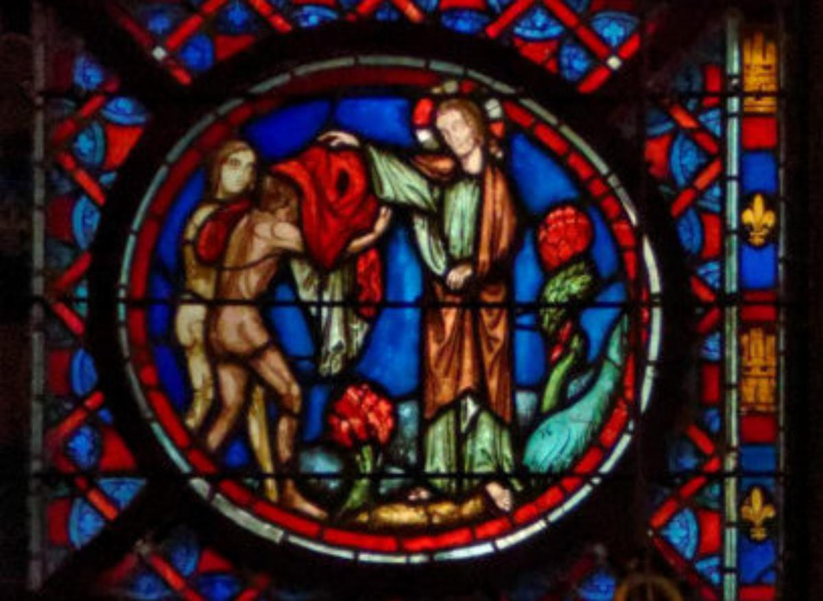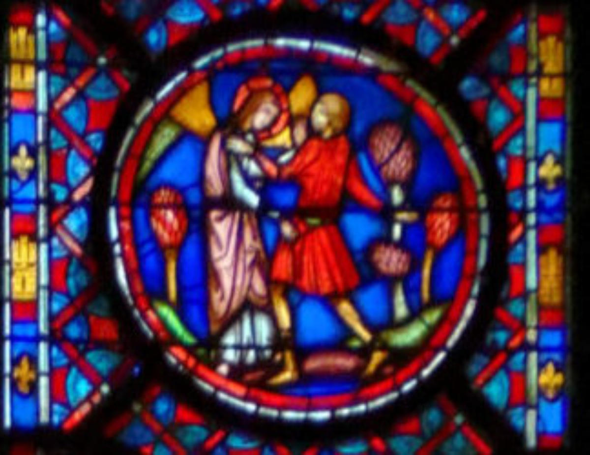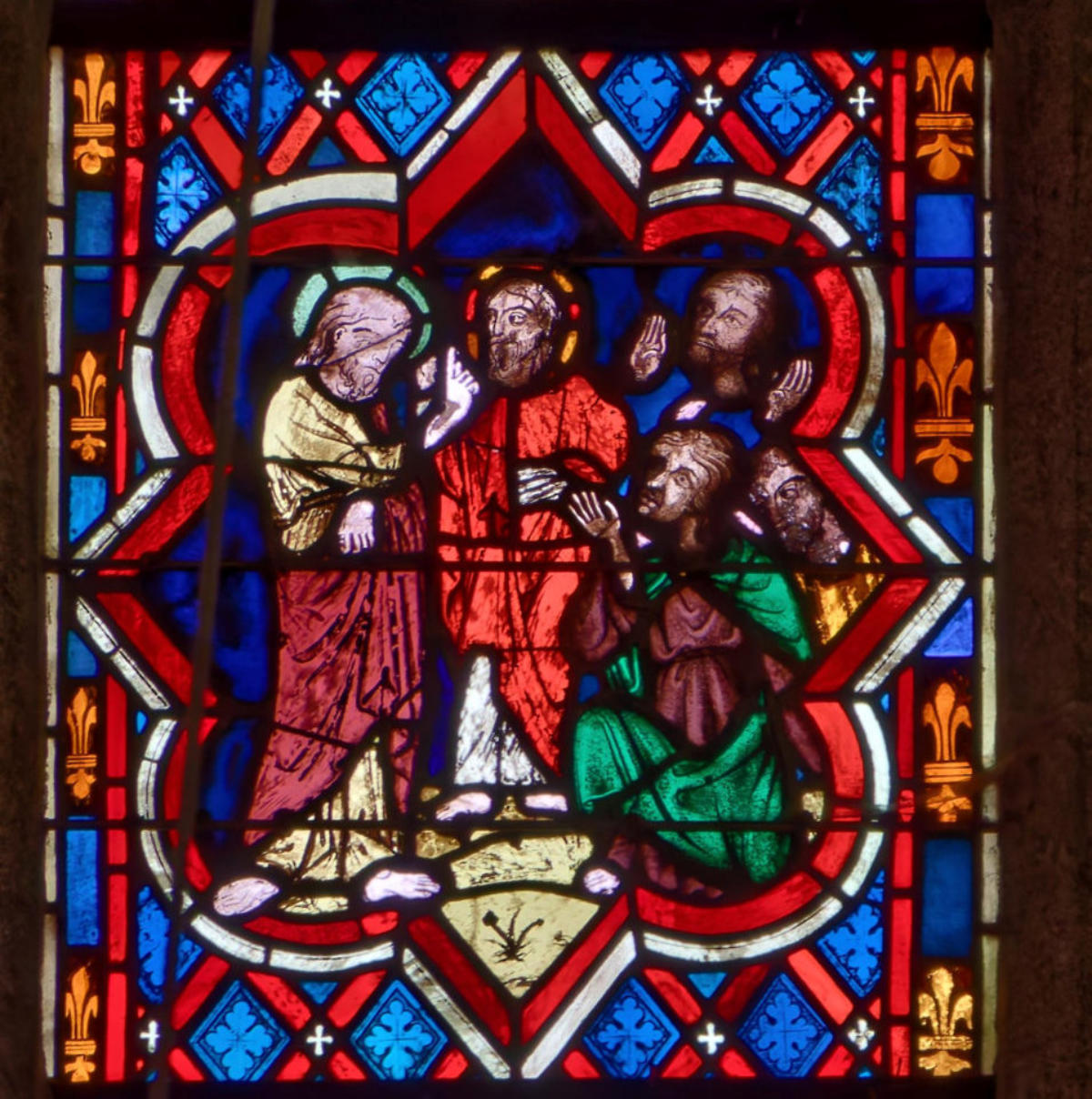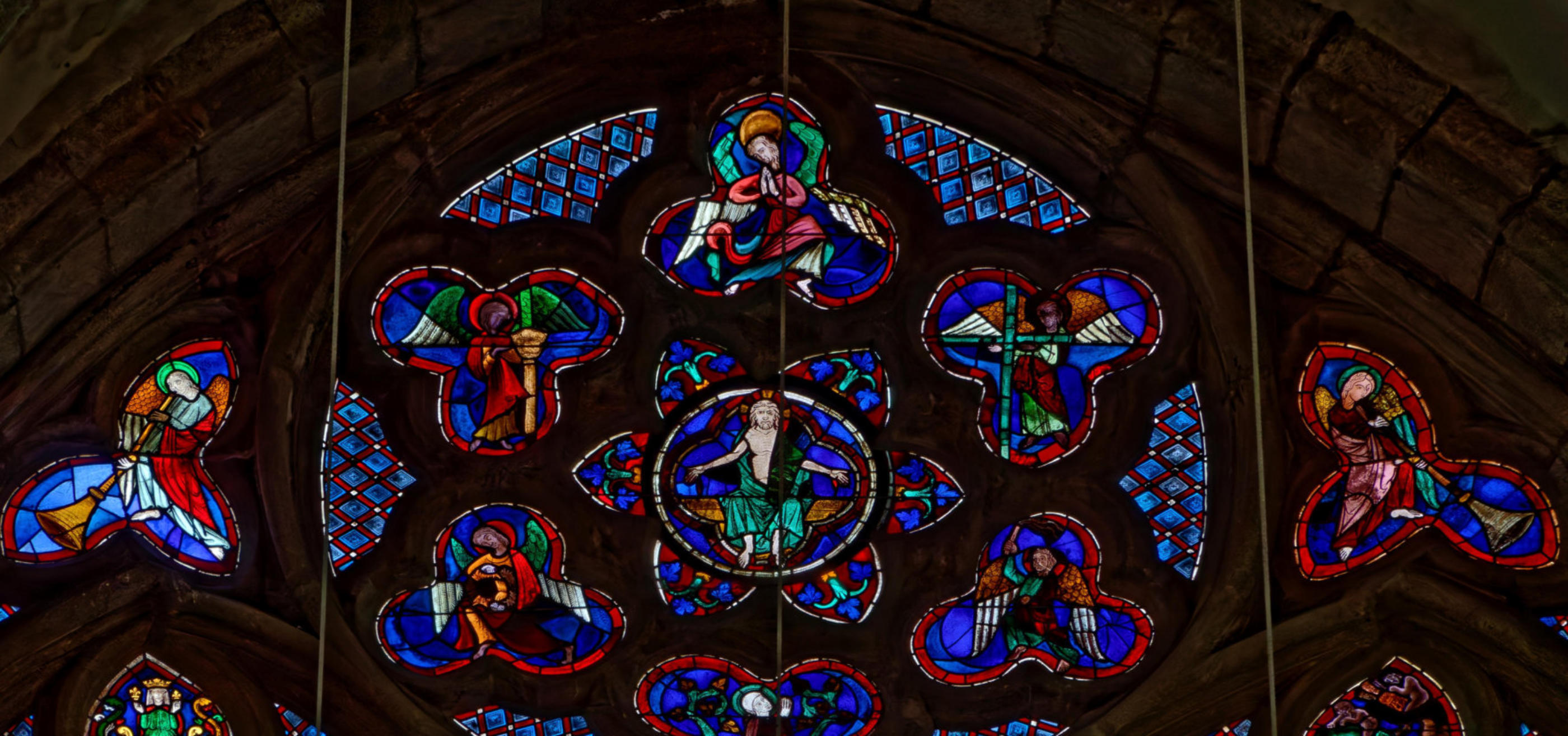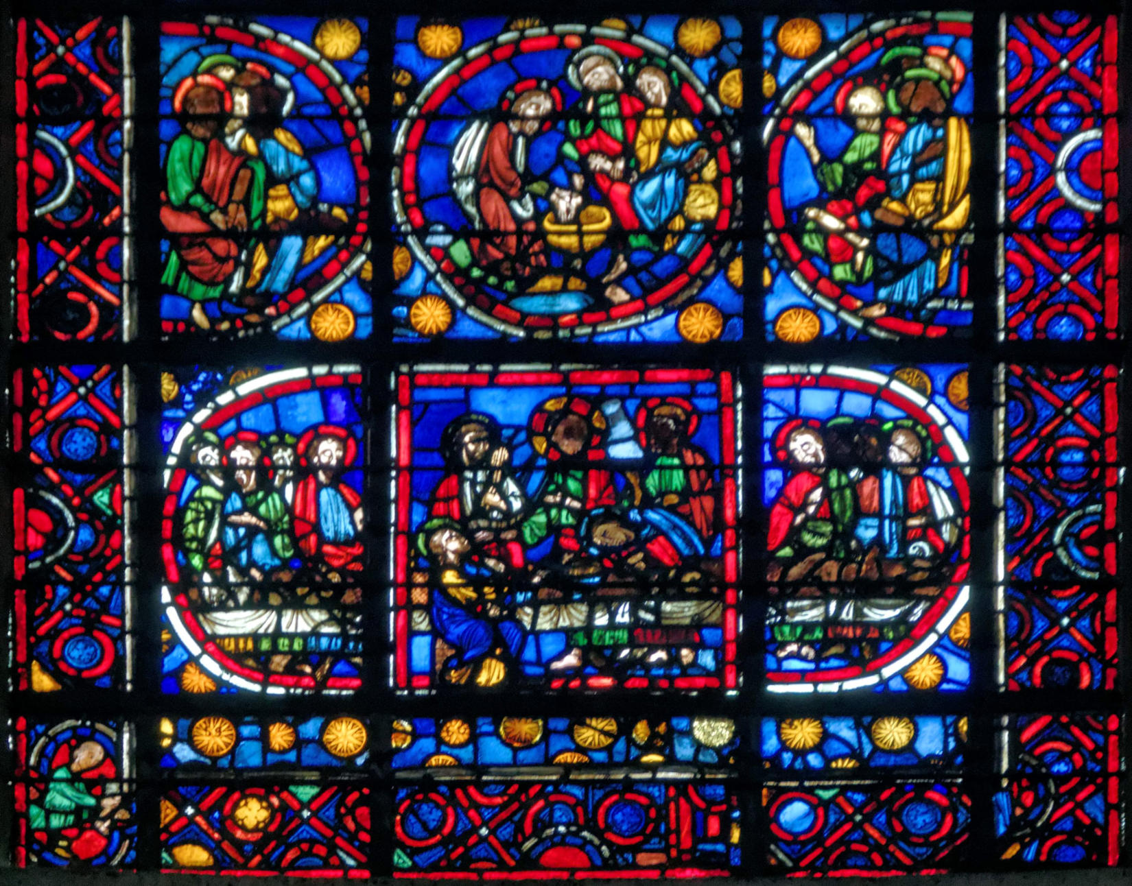 1205-1215 Chartres Cathédrale Notre-DameBaie 37 Vitrail symbolique de la Passion2 médaillonsAbraham se tourne vers Isaac qui porte le bois du sacrifice (Déposition de croix)L'ange retient le bras d'Abraham