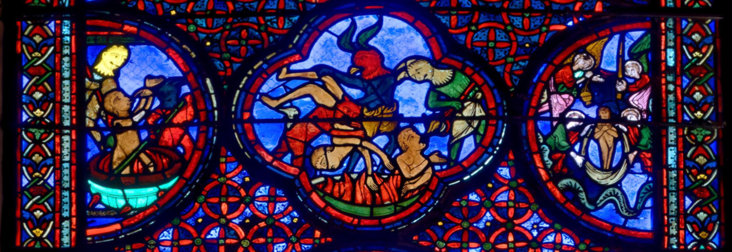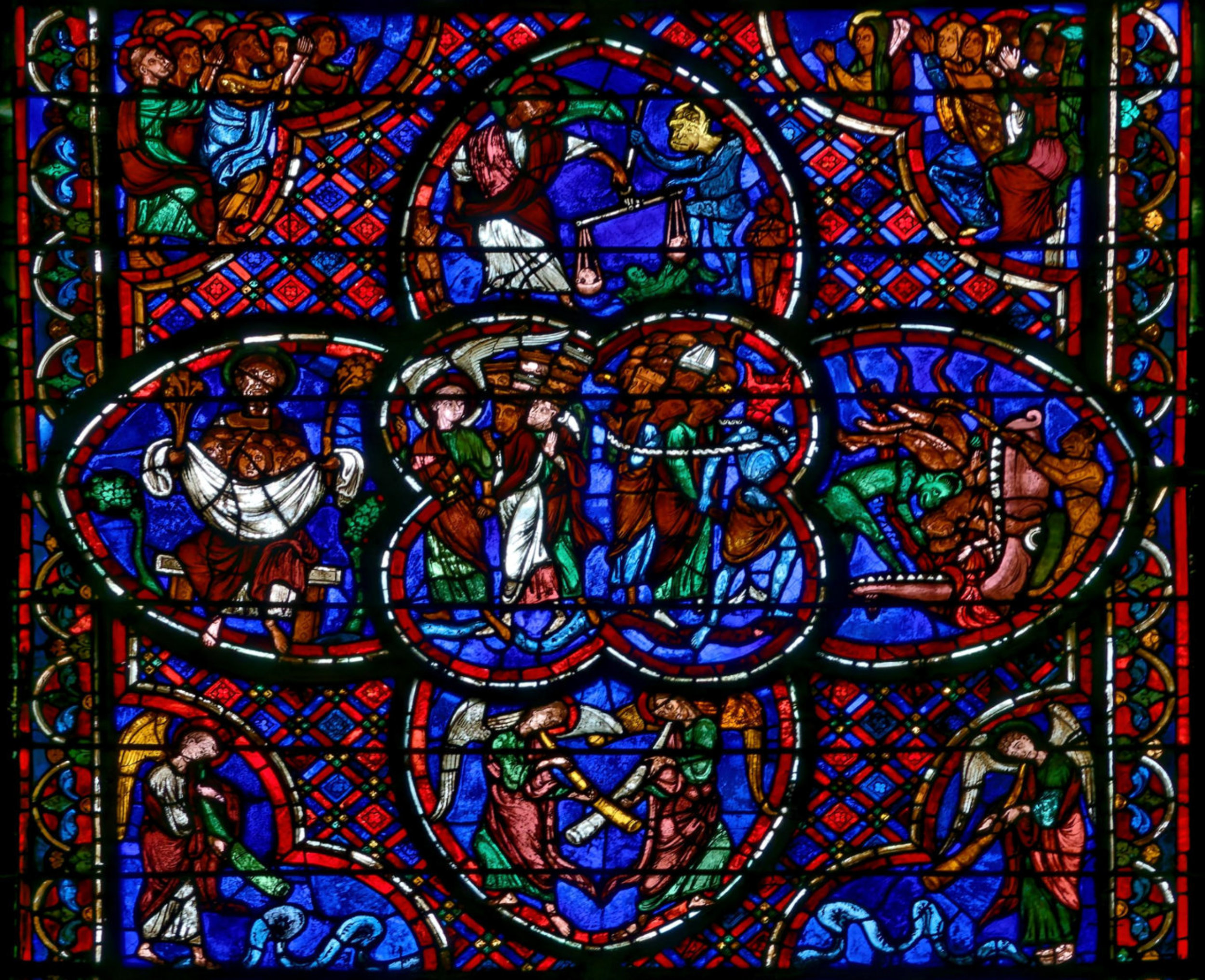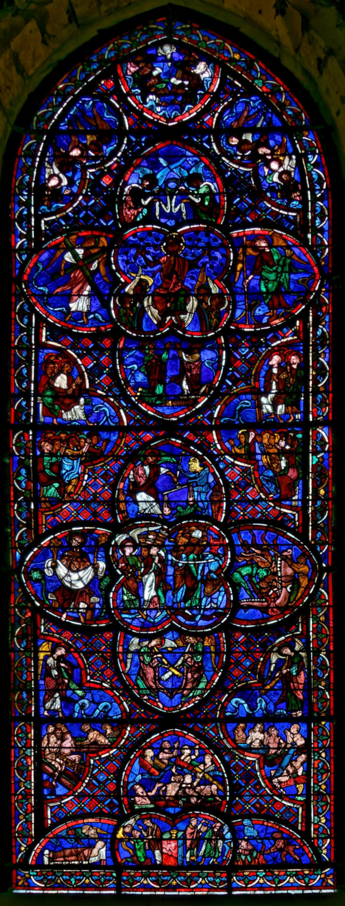 1210-1215Bourges Cathédrale Saint-ÉtienneBaie 4Le Jugement dernierAbraham reçoit en son sein les élus alors que les damnés sont engloutis par le Léviathan