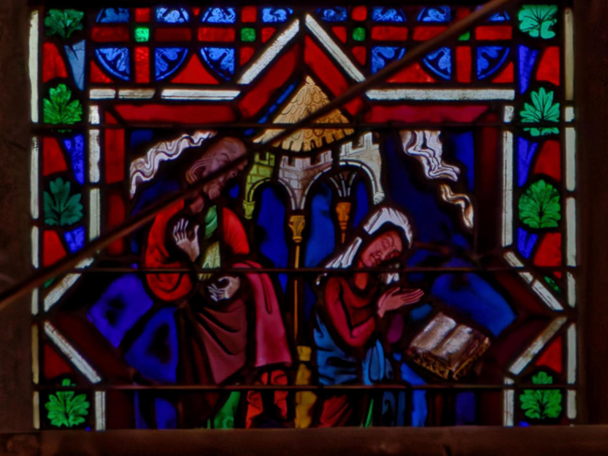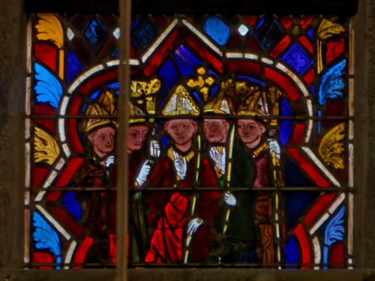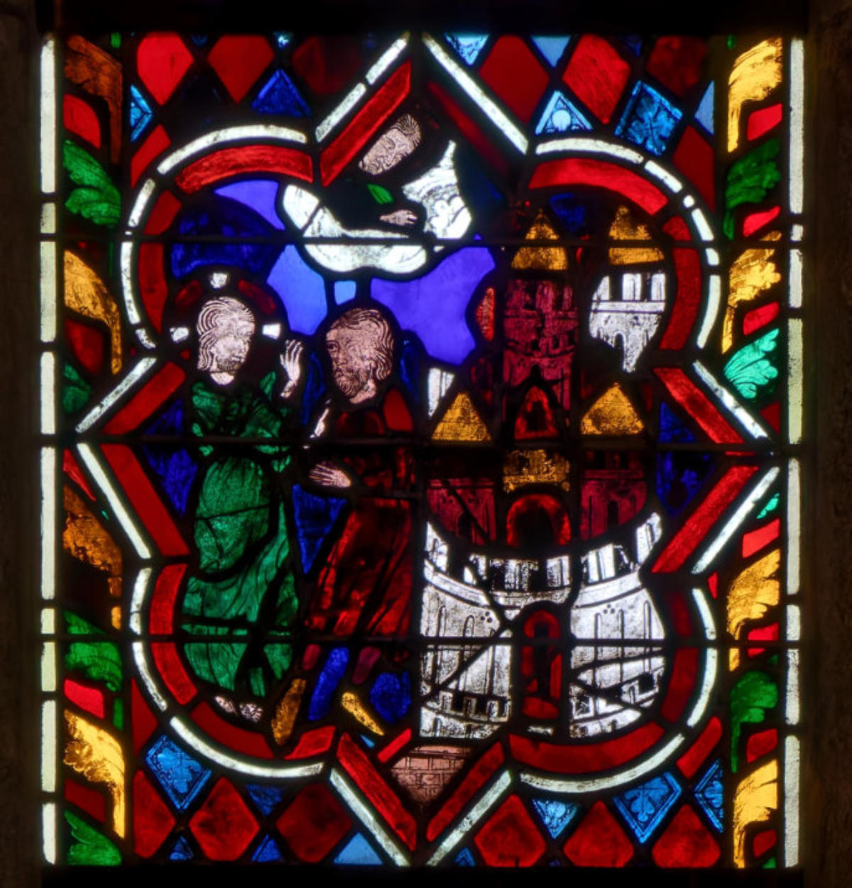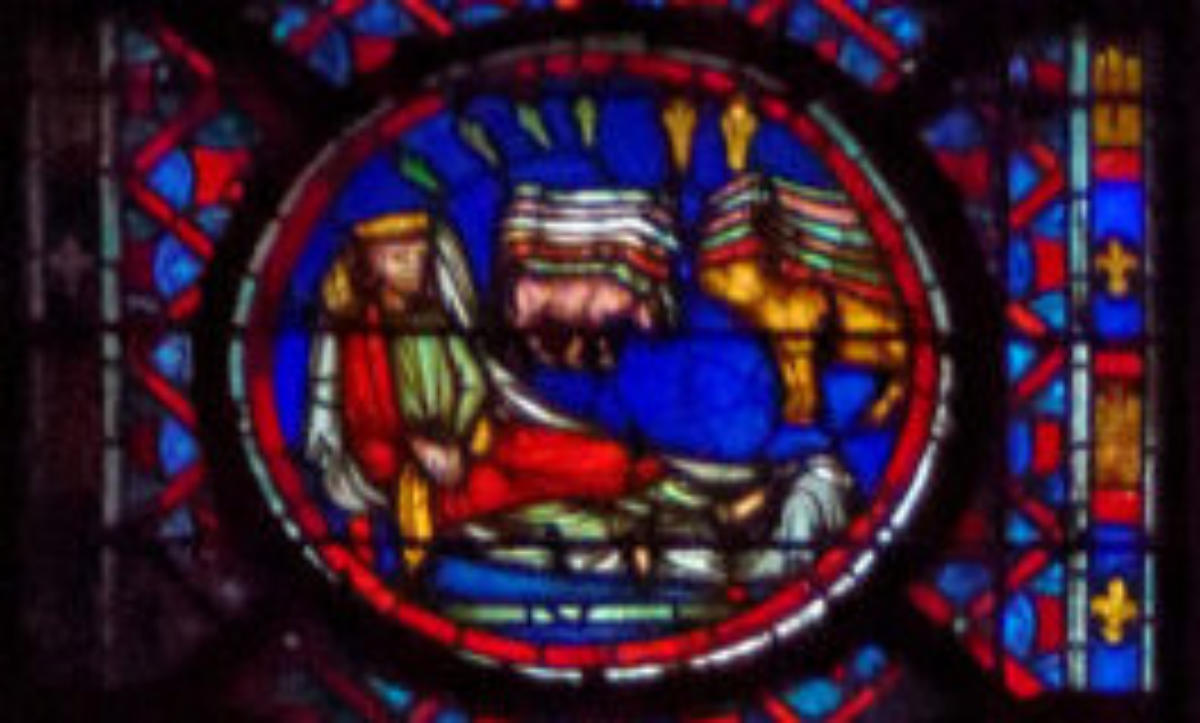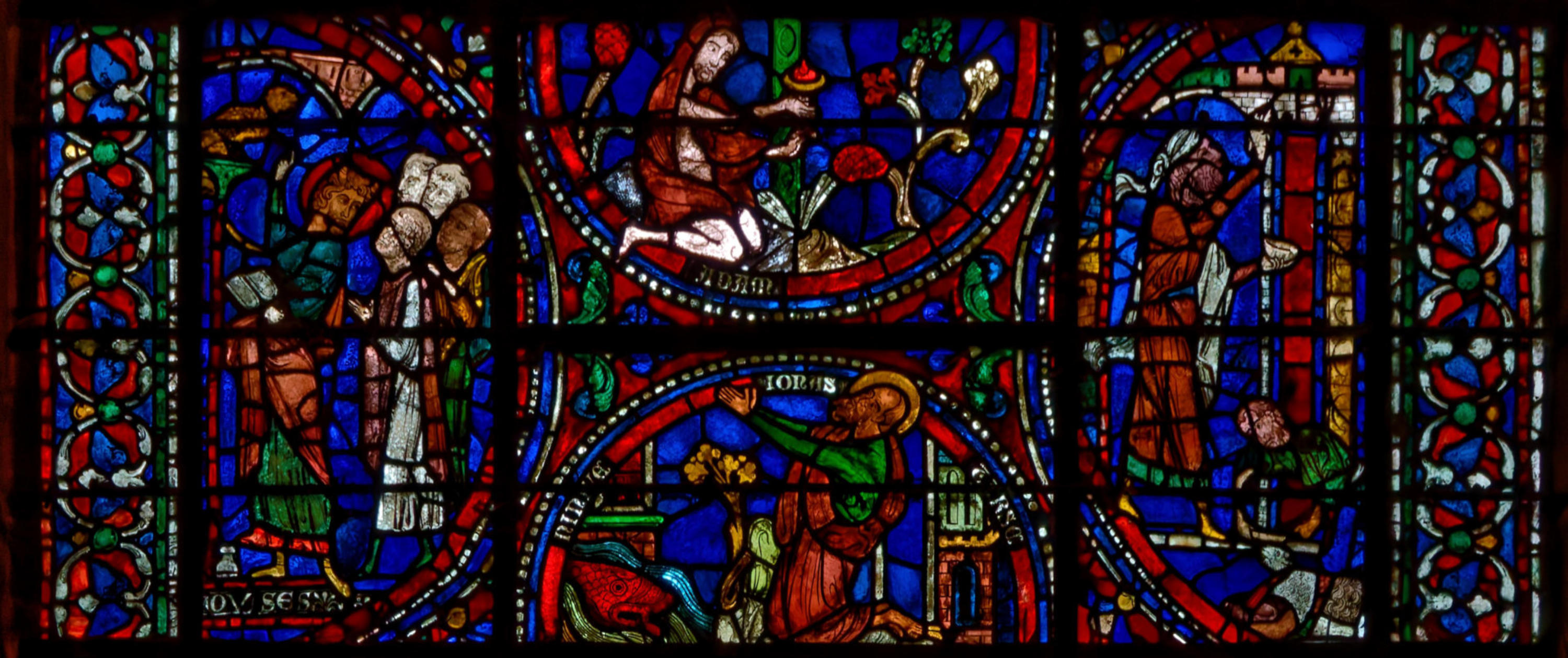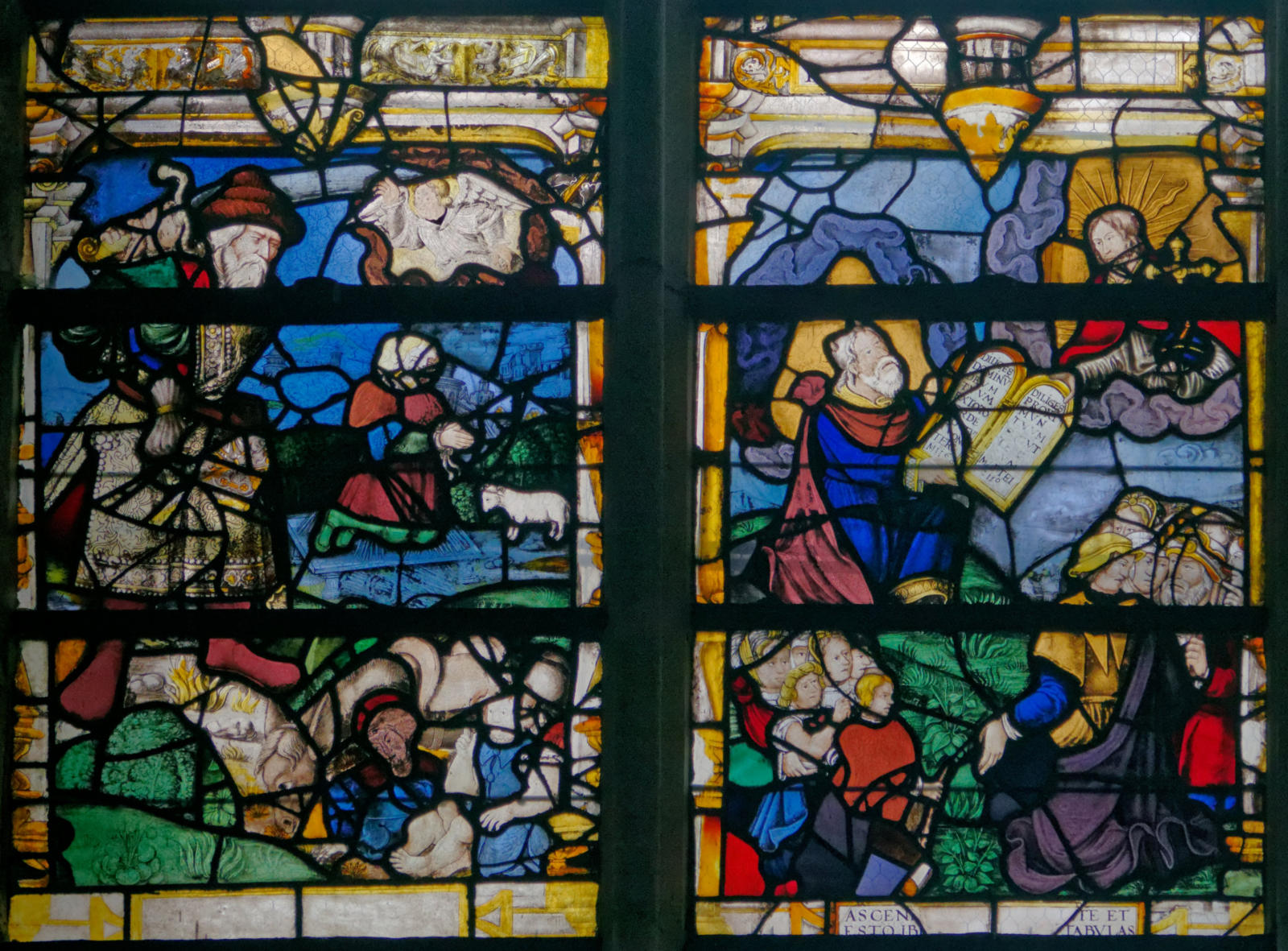 1290 (-1300)Dol-de-BretagneCathédrale Saint-SamsonBaie 1002ème lancette à partir de la gauche: Histoire d’Abraham (Présence à Dol de reliques du chêne de Mambré) Sacrifice d’IsaacLoth et sa femme quittent Sodome suivis par un angeAbraham prie Dieu d’épargner Sodome Abraham et Melchisédech Abraham prie devant une ville, avec un ange et la main divine