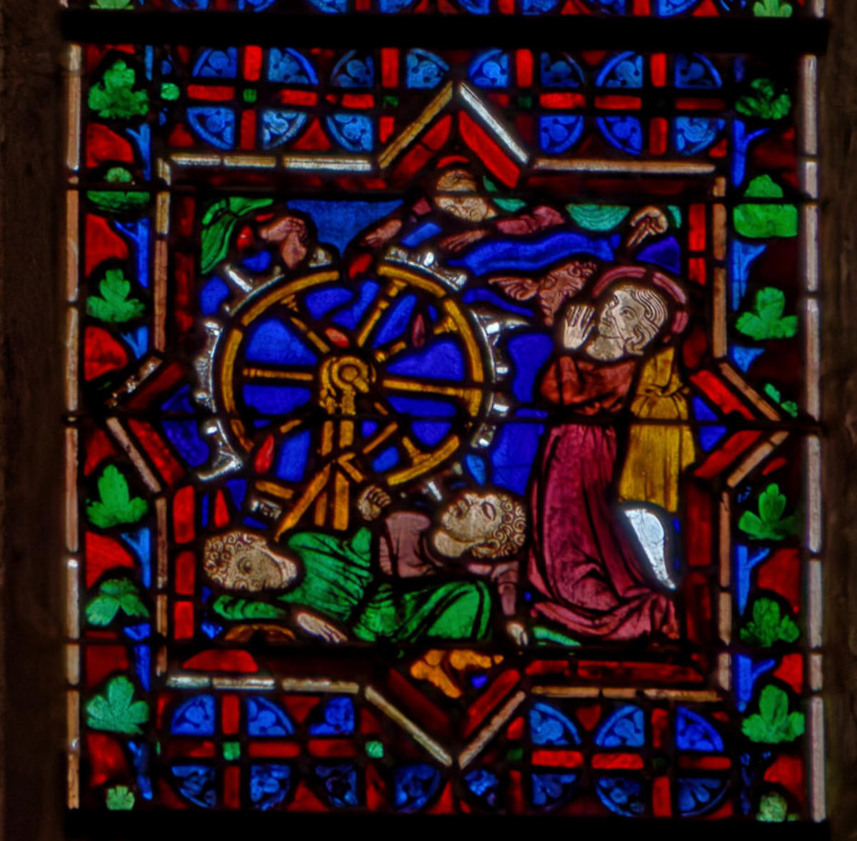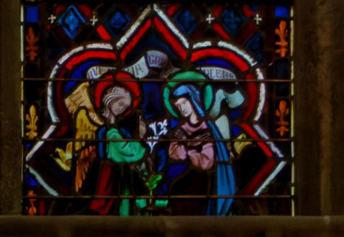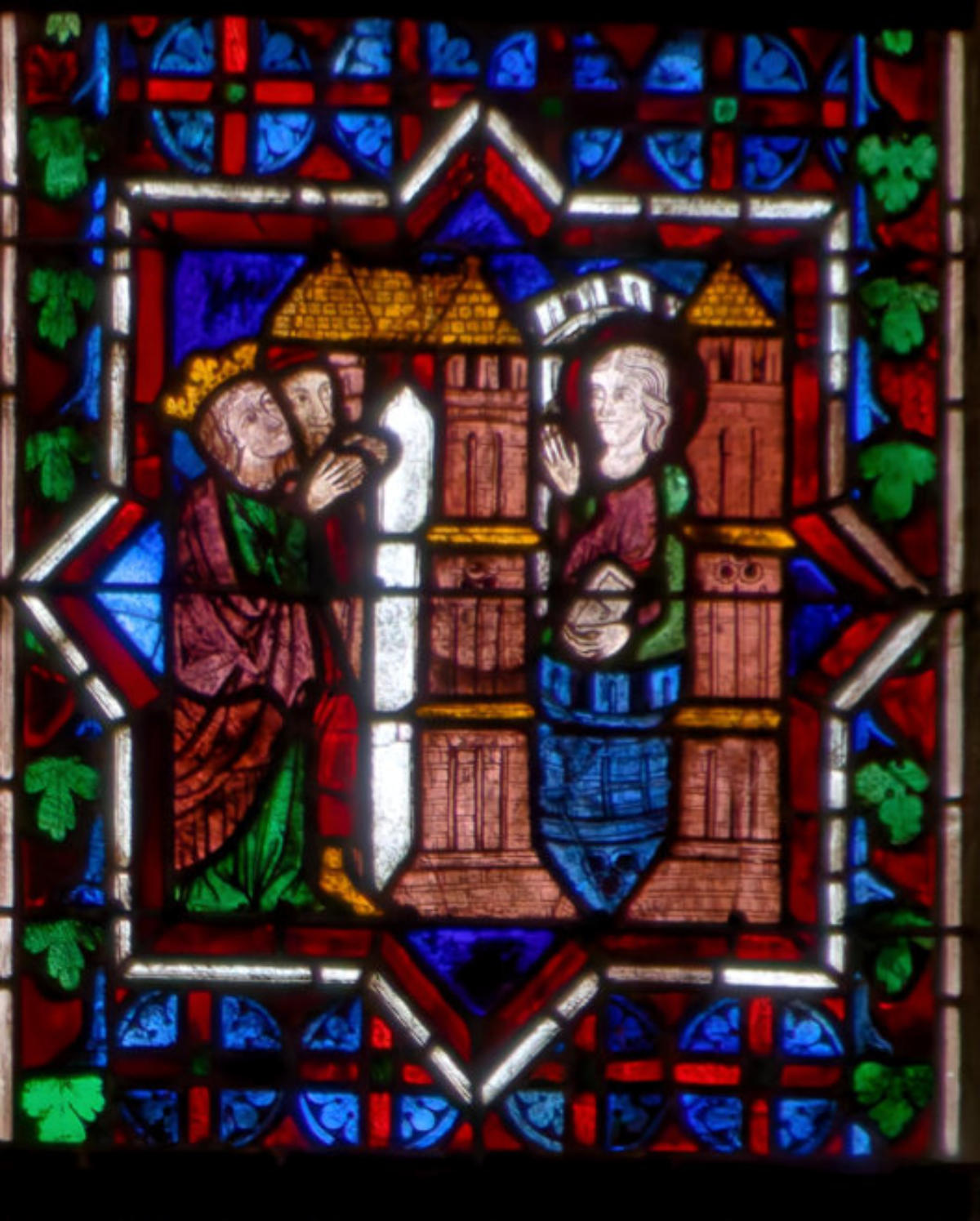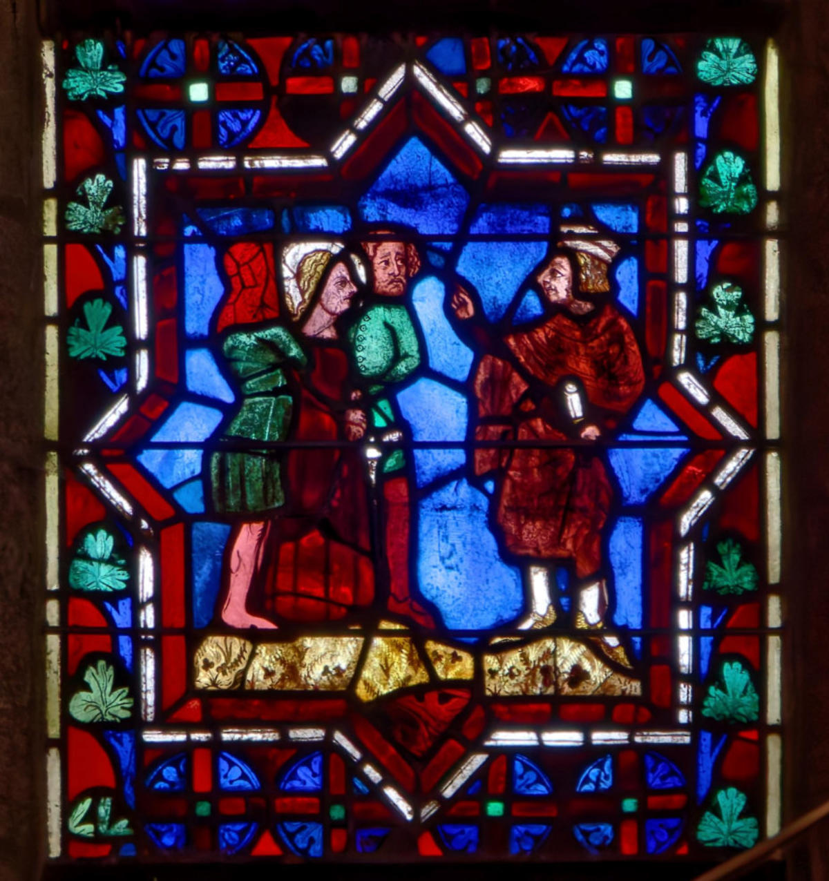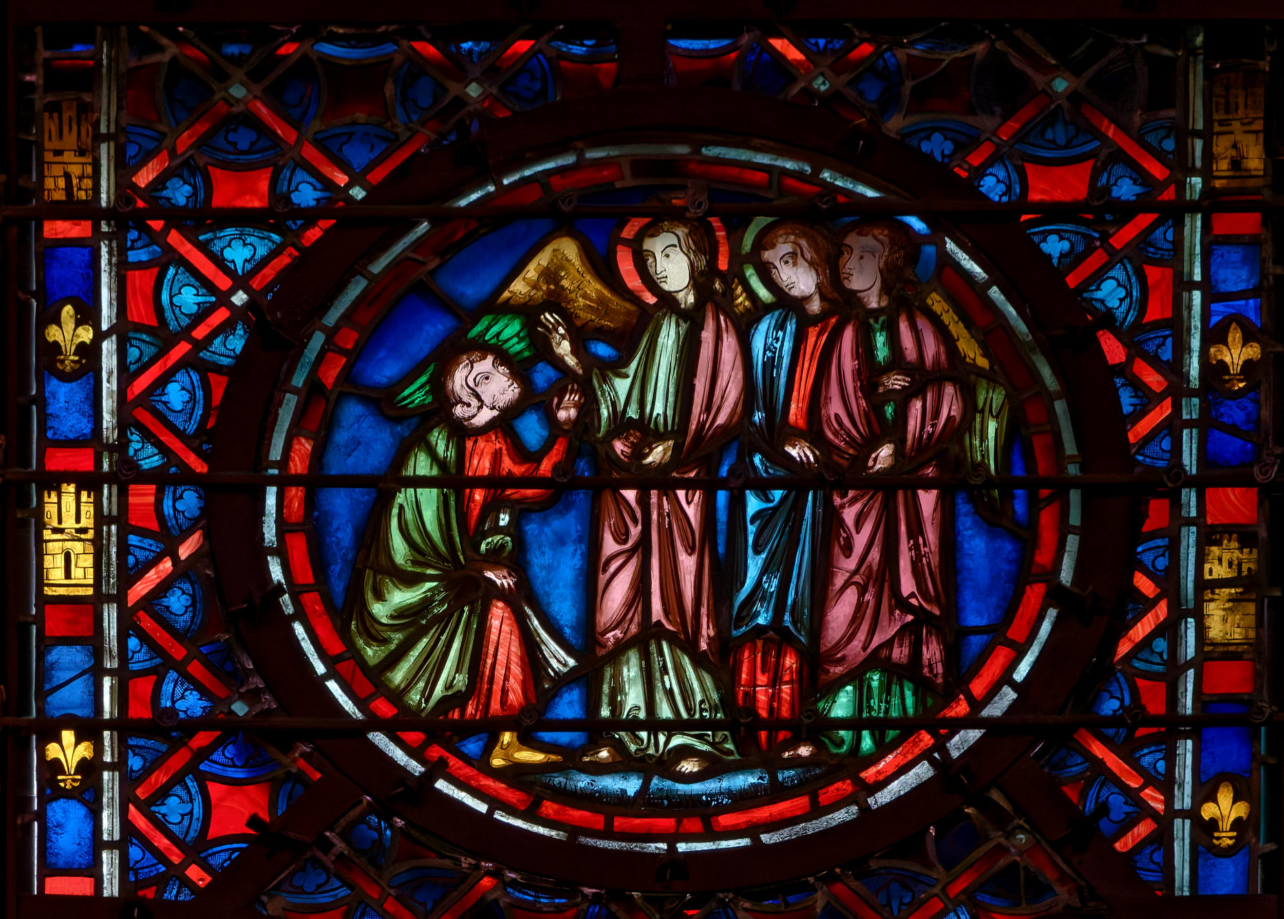 1290 (-1300)Dol-de-BretagneCathédrale Saint-SamsonBaie 1002ème lancette à partir de la gauche: Histoire d’Abraham (Présence à Dol de reliques du chêne de Mambré) Sacrifice d’IsaacLoth et sa femme quittent Sodome suivis par un angeAbraham prie Dieu d’épargner Sodome Abraham et Melchisédech Abraham prie devant une ville, avec un ange et la main divine