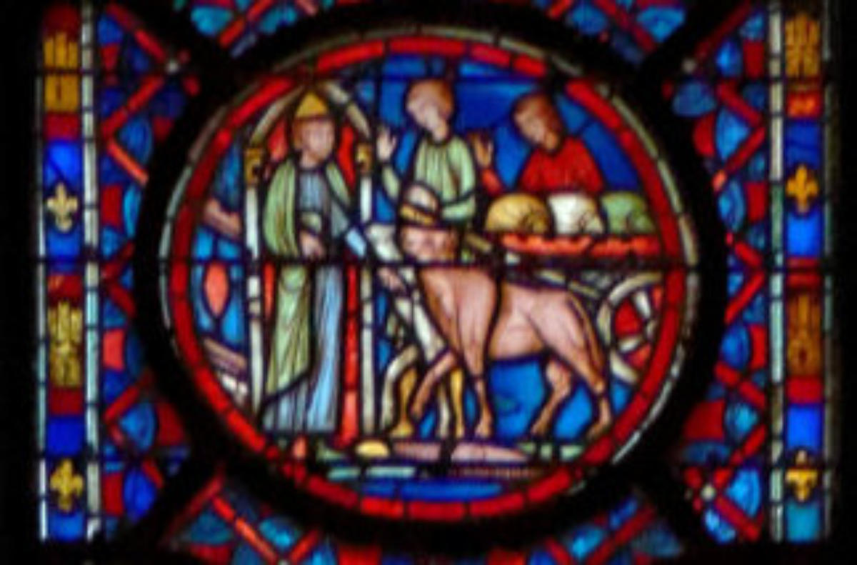 1210-1215Bourges Cathédrale Saint-ÉtienneBaie 3Vitrail typologique de la Nouvelle Alliance2 médaillons :Sous le portement de la croix, Isaac porte le bois en croix et l’ange empêche le bras d’Abraham de frapper