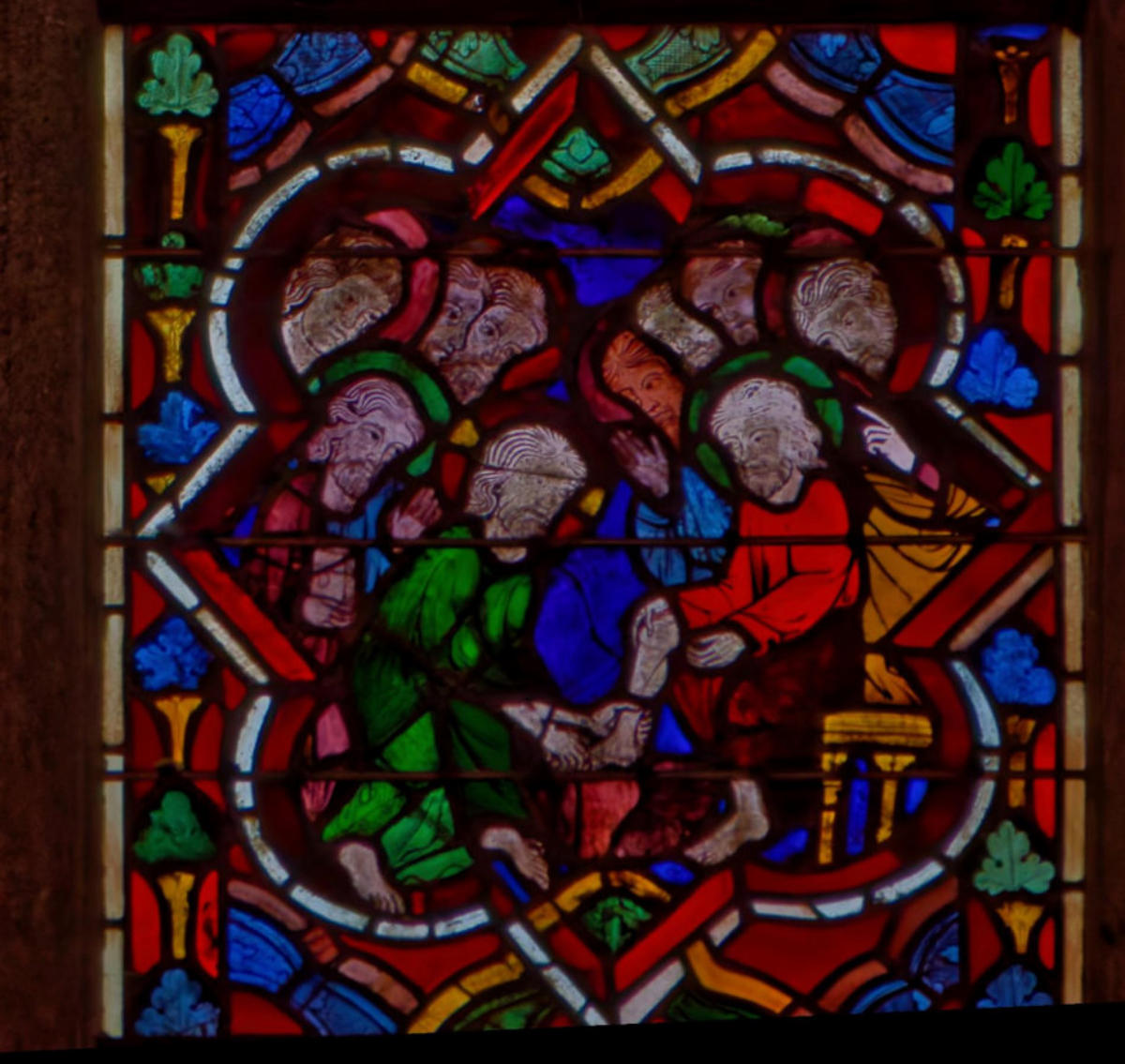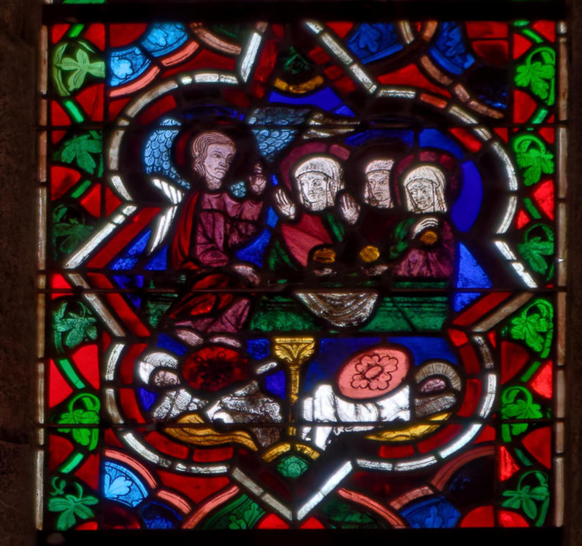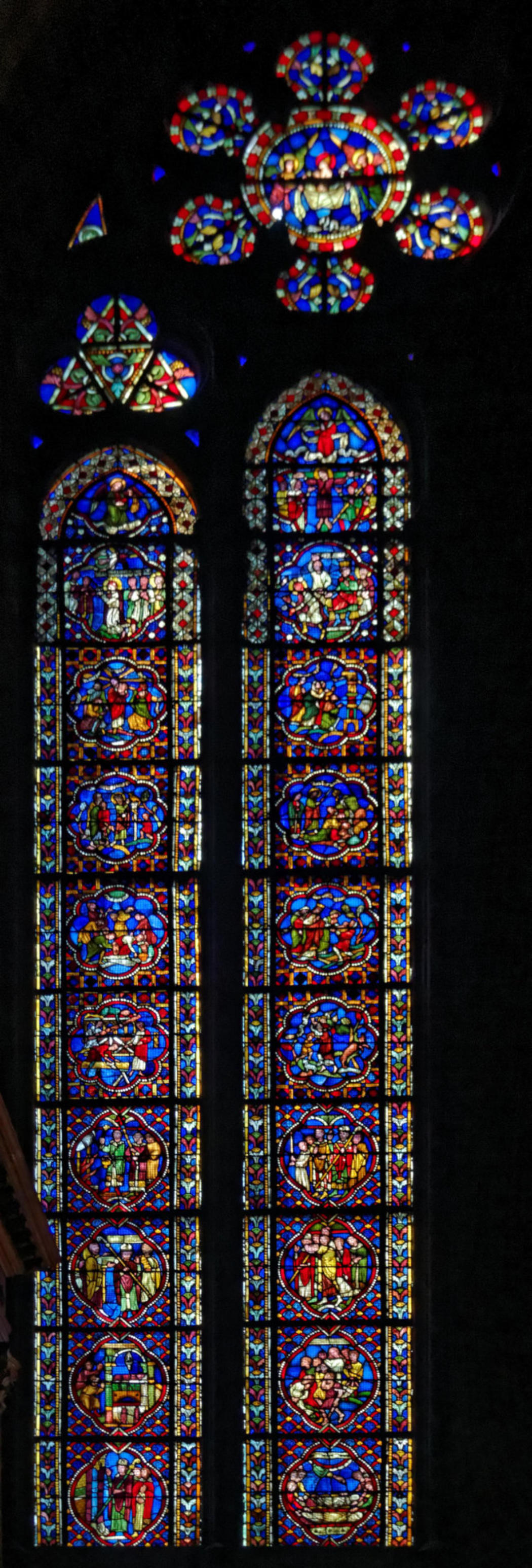 1225AuxerreCathédrale Saint-ÉtienneBaie 1910 médaillonsSacrifice d'Abraham Abraham reçoit les trois anges Ils lui annoncent la destruction de Sodome et Gomorrhe Abraham intercède pour les villes condamnées Loth accueille 2 anges devant Sodome La femme de Loth sert les 2 anges Loth quitte Sodome avec sa familleLa femme de Loth changée en sel Un ange frappe de son glaive un sodomiteLoth entre ses 2 filles